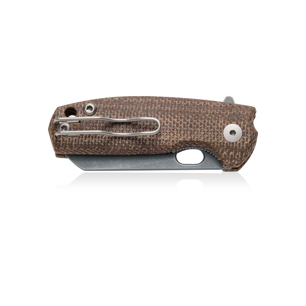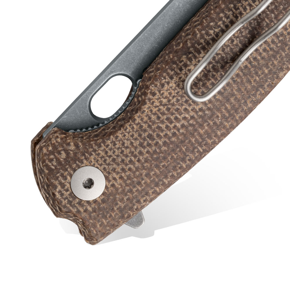 Klips mocujący w stylu Tip-Up i Deep Carry zlokalizowany na zakończeniu rękojeści noża umożliwia przenoszenie zamkniętego ostrza wierzchołkiem do góry oraz dyskretne przenoszenie całości w kieszeni. Klips wykonany został z drutu ze stali nierdzewnej (bead blasted AISI 302 Stainless Steel). Klips pasuje świetnie do koncepcji ultralekkiego foldera (całość wazy tylko 80 gram).
