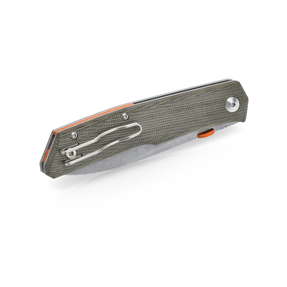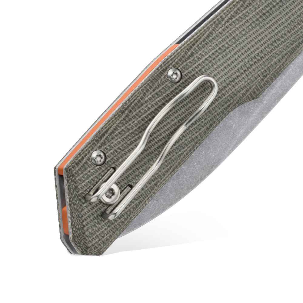 Klips mocujący w stylu Tip-Up zlokalizowany na zakończeniu rękojeści noża umożliwia przenoszenie zamkniętego ostrza wierzchołkiem do góry oraz dyskretne przenoszenie całości w kieszeni. Klips wykonany został z drutu ze stali nierdzewnej.