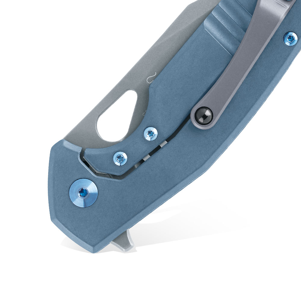 Klips mocujący w stylu Tip-Up zlokalizowany na zakończeniu rękojeści noża umożliwia przenoszenie zamkniętego ostrza wierzchołkiem do góry. Klips wykonany został z tytanu, a jego kolor powstały w procesie anodyzacji jest spójny z barwą śrub i pivota. W klipsie umieszczono kulkę ceramiczną, która jest elementem trzymającym nóż solidnie zaczepiony o krawędź kieszeni.