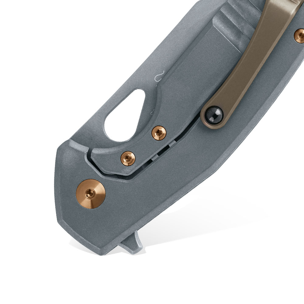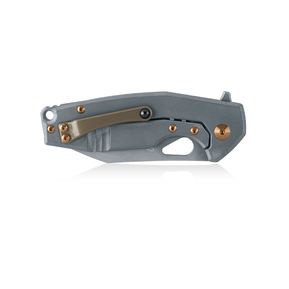 Klips mocujący w stylu Tip-Up zlokalizowany na zakończeniu rękojeści noża umożliwia przenoszenie zamkniętego ostrza wierzchołkiem do góry. Klips wykonany został z tytanu, a jego kolor powstały w procesie anodyzacji jest spójny z barwą śrub i pivota. W klipsie umieszczono kulkę ceramiczną, która jest elementem trzymającym nóż solidnie zaczepiony o krawędź kieszeni.