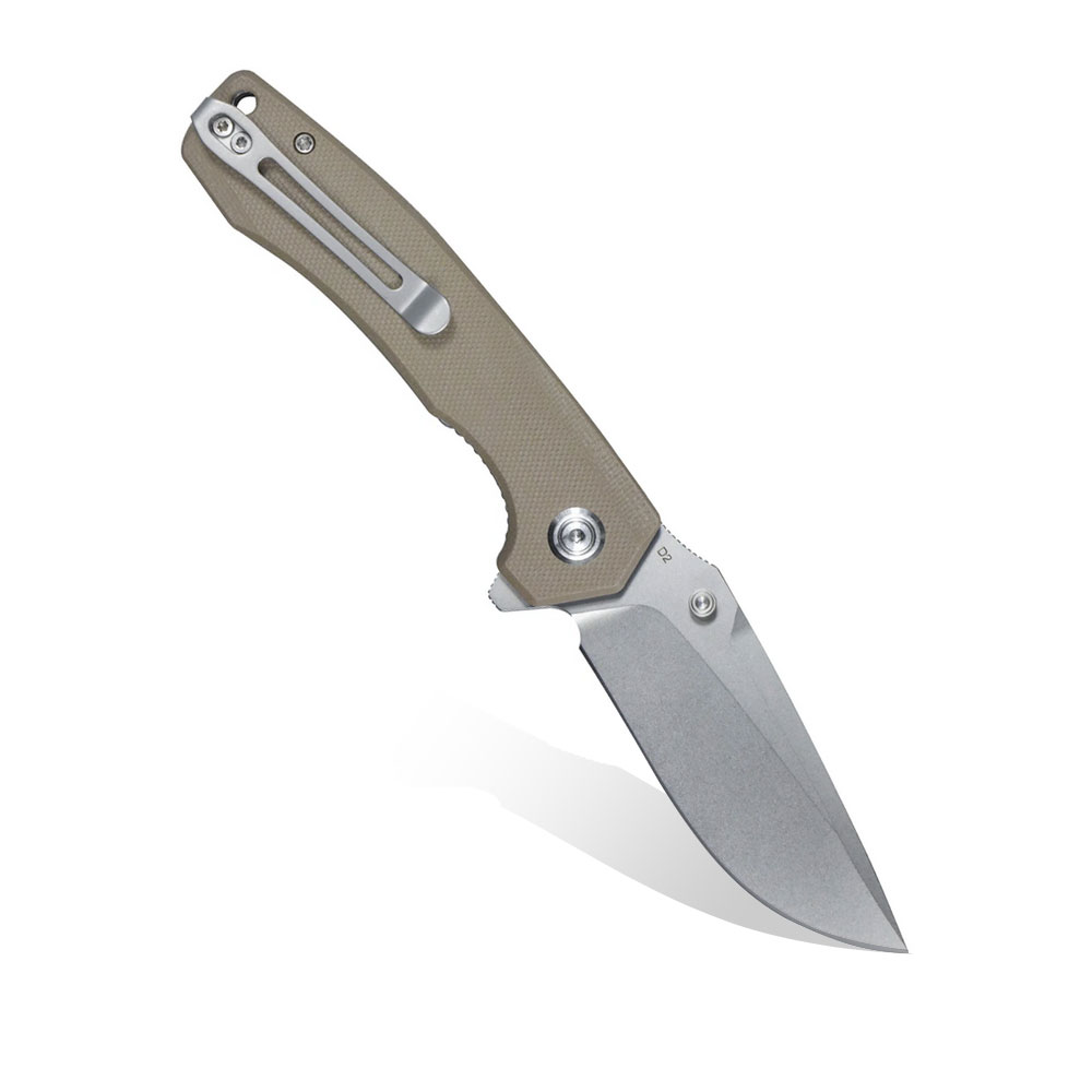 Nóż składany Kubey Calyce KU901D D2 Tan G10 posiada wydajne ostrze typu drop point ze znanej z efektywności cięcia i nieuciążliwej w ostrzeniu i pielęgnacji szkiełkowanej stali D2 (bead blasting). Nóż jest otwierany obustronnym kołkiem lub flipperem (płetwą) a ostrze przed zamknięciem zabezpiecza blokada liner lock. Okładki rękojeści wykonane zostały z kompozytu G10 (kolor pustynny Tan / Desert Tan).