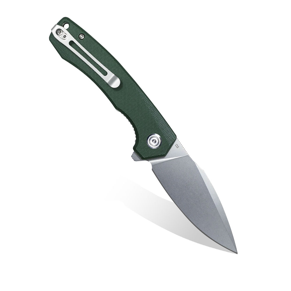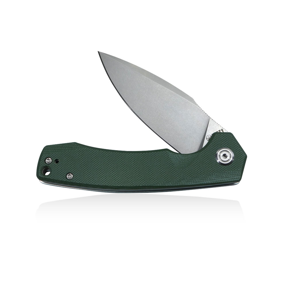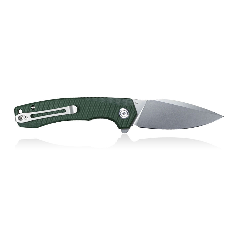 Nóż składany Kubey Calyce KU901G D2 Green G10 posiada wydajne ostrze typu spear point ze znanej z efektywności cięcia i nieuciążliwej w ostrzeniu i pielęgnacji szkiełkowanej stali D2 (bead blasting). Nóż jest otwierany flipperem (płetwą) a ostrze przed zamknięciem zabezpiecza blokada liner lock. Okładki rękojeści wykonane zostały z zielonego kompozytu G10.