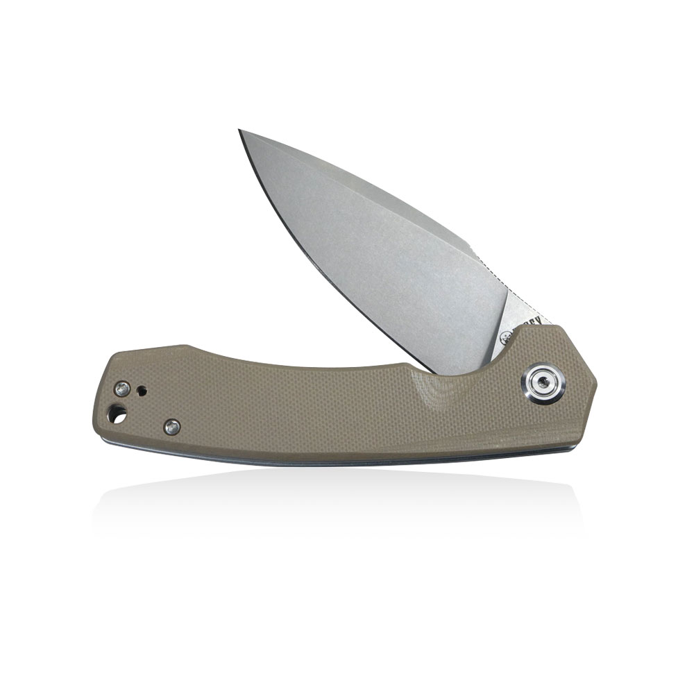 Nóż składany Kubey Calyce KU901H D2 Tan G10 posiada wydajne ostrze typu spear point ze znanej z efektywności cięcia i nieuciążliwej w ostrzeniu i pielęgnacji szkiełkowanej stali D2 (bead blasting). Nóż jest otwierany flipperem (płetwą) a ostrze przed zamknięciem zabezpiecza blokada liner lock. Okładki rękojeści wykonane zostały z kompozytu G10 (kolor pustynny: Desert Tan / Tan).
