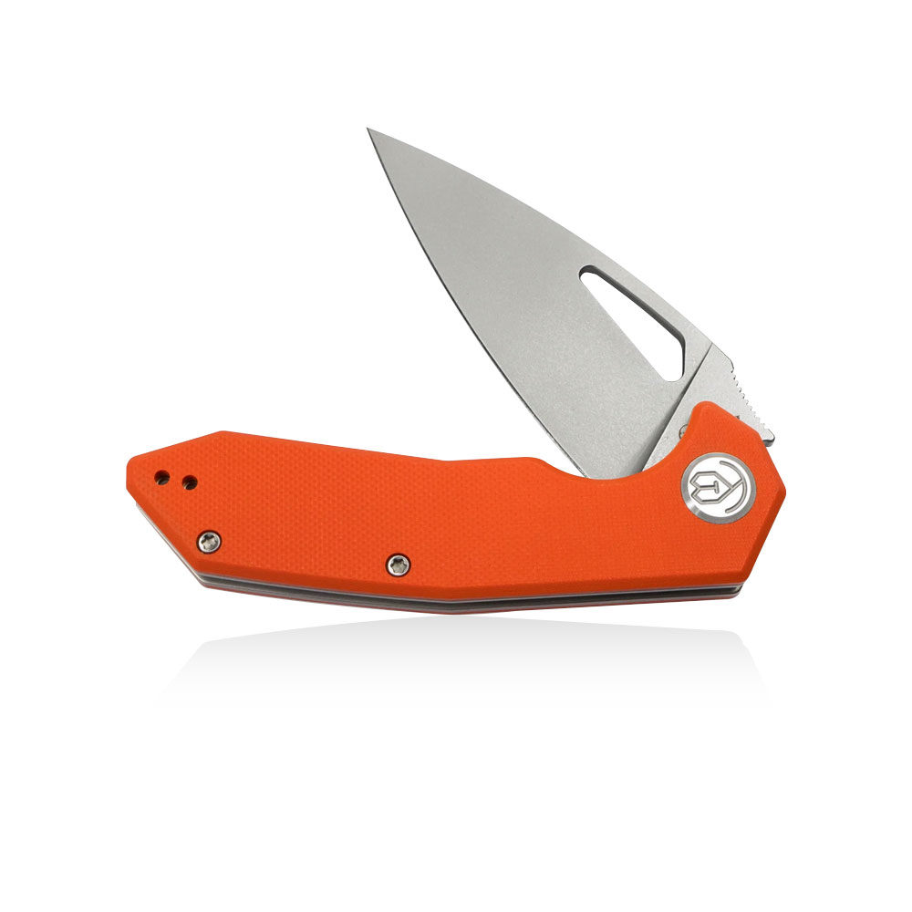 Nóż składany Kubey Coeus KU122D D2 Orange G10 posiada wydajne ostrze typu spear point ze znanej z efektywności cięcia i nieuciążliwej w ostrzeniu i pielęgnacji szkiełkowanej stali D2 (wykończenie bead blasted). Nóż jest otwierany przy użyciu otworu w głowni a ostrze przed zamknięciem zabezpiecza blokada liner lock. Okładki rękojeści wykonane zostały z pomarańczowego kompozytu G10.
