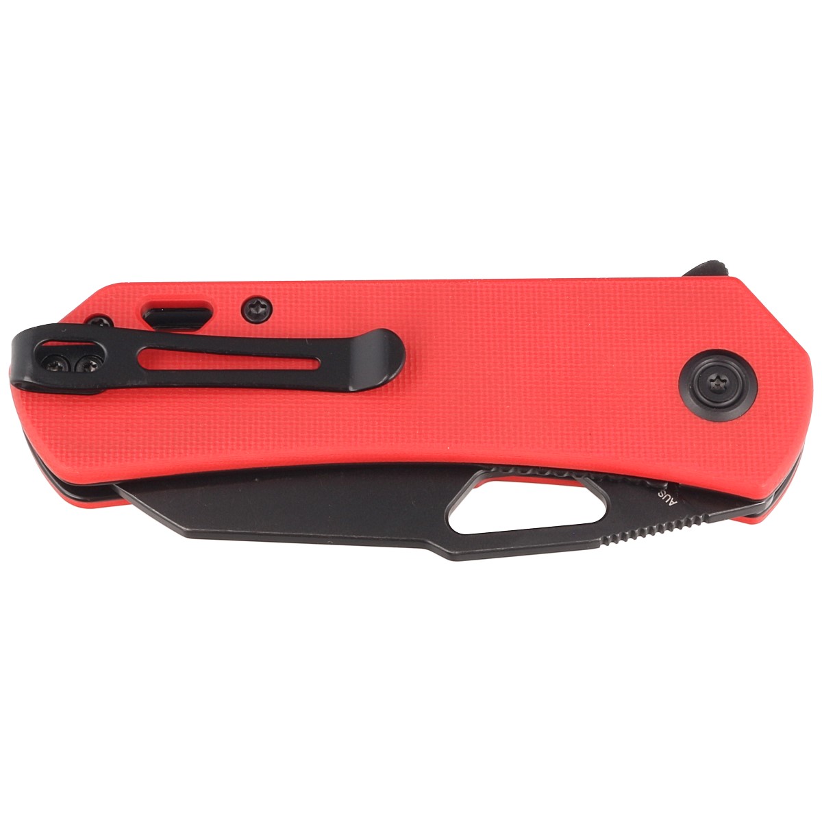 Rękojeść noża wykonana jest z trwałego materiału G10 o intensywnym kolorze Duroc Red, z teksturą zapewniającą pewny chwyt. Konstrukcja typu open-backed, bez tradycyjnego backspacera, redukuje wagę i ułatwia czyszczenie. Jest to solidna i niezawodna konstrukcja, która sprosta wymaganiom wieloletniego użytkowania. Stylizowane logo firmy zdobi oś pivota. Dwustronny, metalowy klips deep carry umożliwia dyskretne noszenie noża w kieszeni w pozycji tip-up (czubkiem ostrza do góry). Ponadto, nad klipsem znajduje się otwór typu lanyard hole, który umożliwia przewleczenie linki zabezpieczającej lub dekoracyjnej.