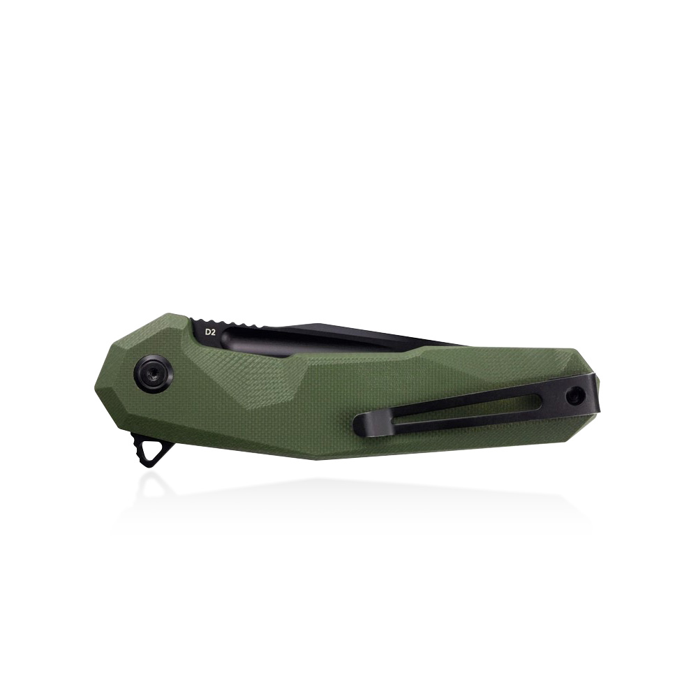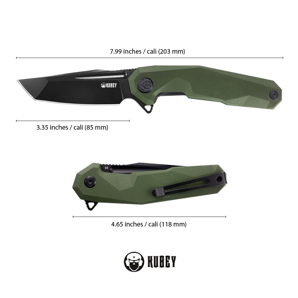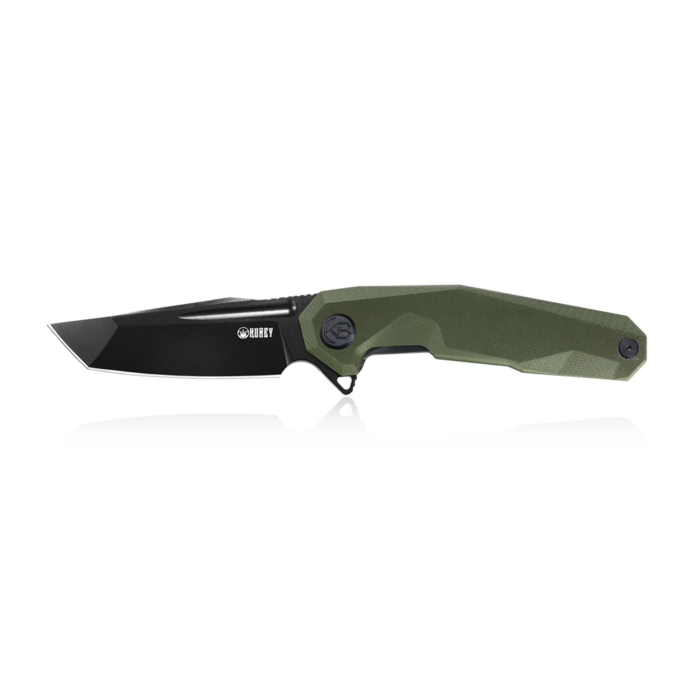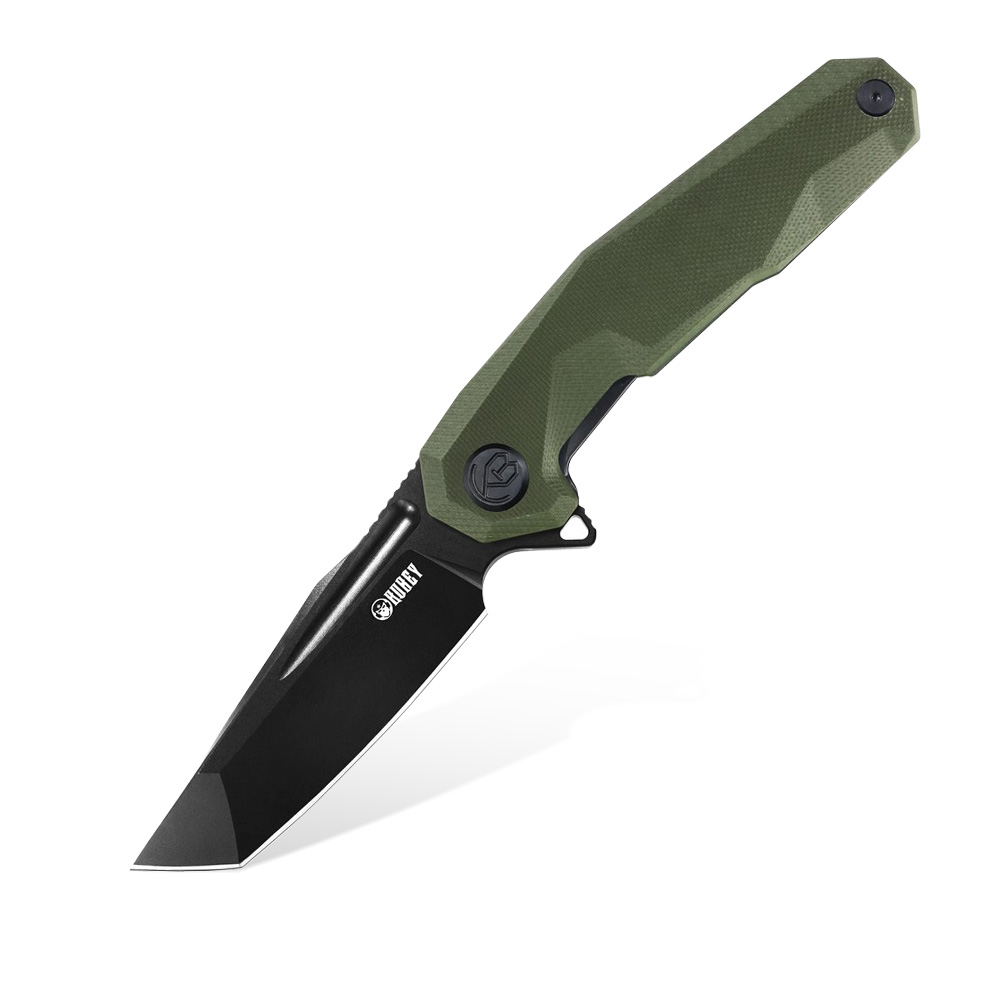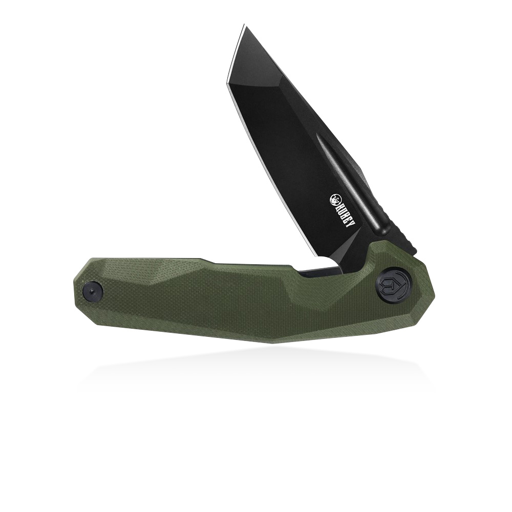 Nóż składany Kubey Carve KB237B posiada wydajne ostrze typu tanto ze znanej z efektywności cięcia i nieuciążliwej w ostrzeniu i pielęgnacji stali D2 powleczonej czarną tytanową powłoką. Rękojeść noża wykonana została z zielonego kompozytu G10. Otwieranie noża następuję za sprawą wystającej płetwy (flipper) a ostrze blokuje blokada typu liner lock.