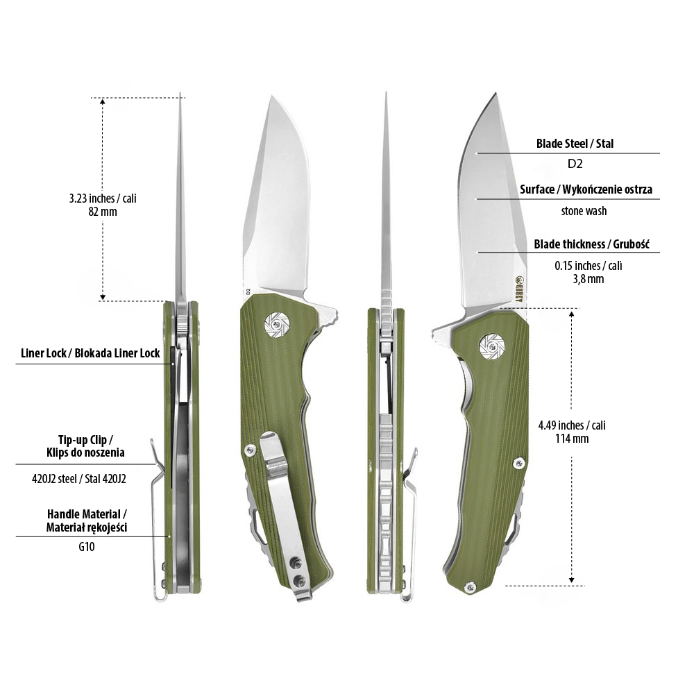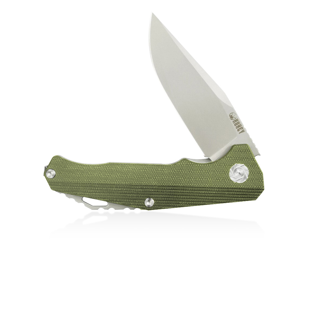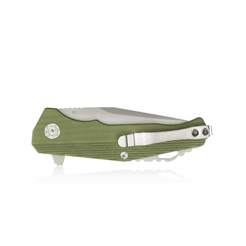 Prezentowany nóż składany Kubey Persia KU216B posiada wydajne ostrze typu drop point ze znanej z efektywności cięcia i nieuciążliwej w ostrzeniu i pielęgnacji stali D2. Rękojeść noża wykonana została z zielonego kompozytu G10. Otwieranie noża następuję za sprawą wystającej płetwy (flipper) a ostrze blokuje blokada typu liner lock.