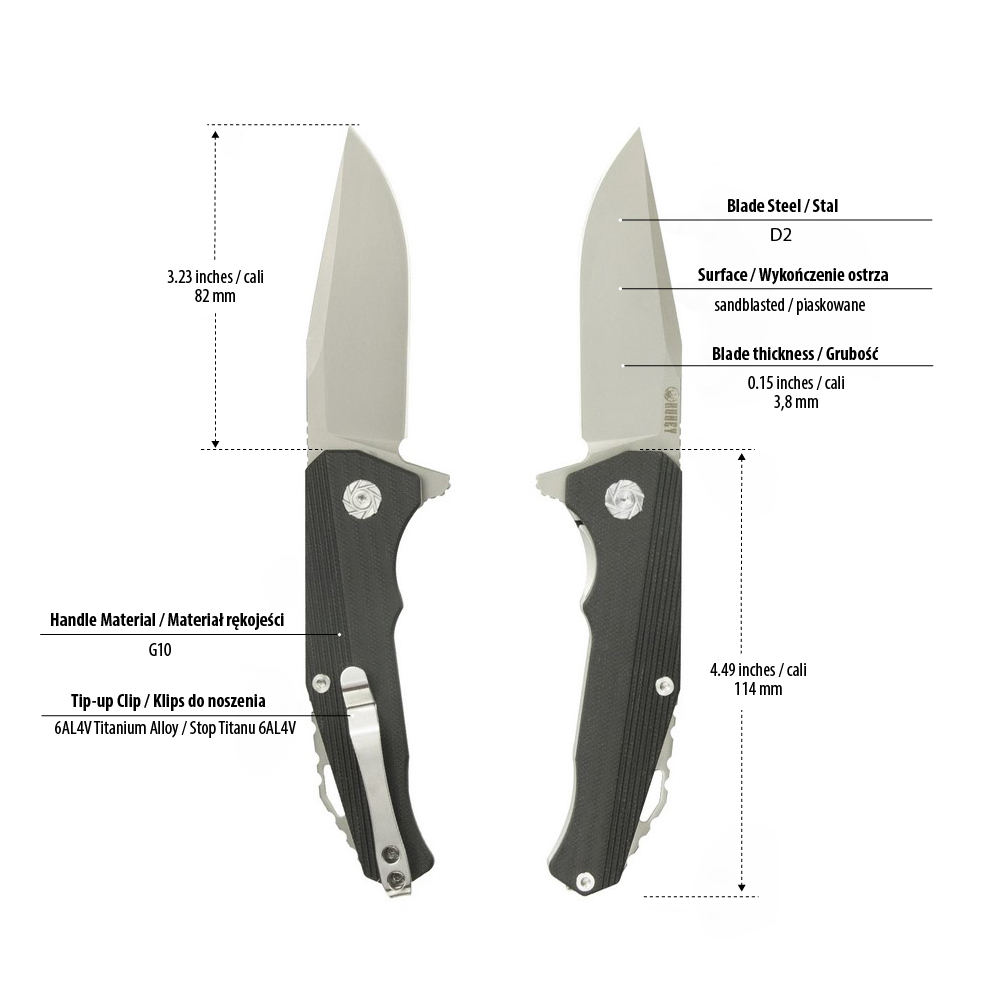 DŁUGOŚĆ OSTRZA: 82 mm / 3.23”GRUBOŚĆ OSTRZA: 3,8 mm / 0.15″