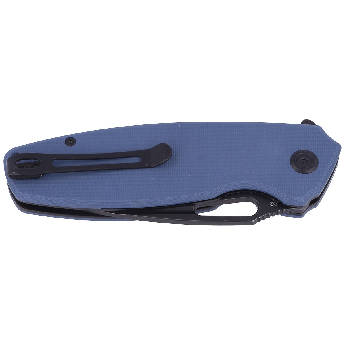 Rękojeść noża wykonana jest z niebieskiego kompozytu G10, który jest włóknem szklanym prasowanym pod ciśnieniem z syntetyczną żywicą. Jest teksturowany, co zapewnia pewny chwyt nawet w trudnych warunkach. Konstrukcja noża to tzw. open-backed, czyli bez typowego backspacera, co zmniejsza wagę i ułatwia czyszczenie. Prosta i solidna konstrukcja zapewnia niezawodność przez wiele lat użytkowania. Głębokie podcięcie na palec (fore finger groove) zwiększa pewność chwytu. Oś pivotu zdobi stylizowane logo marki Kubey Knife. Dwupozycyjny (prawo/lewostronny) metalowy klips deep carry umożliwia dyskretne noszenie noża w kieszeni w pozycji tip-up (czubkiem ostrza do góry). Nad klipsem znajduje się lanyard hole, czyli otwór do przewleczenia linki zabezpieczającej lub ozdobnej.