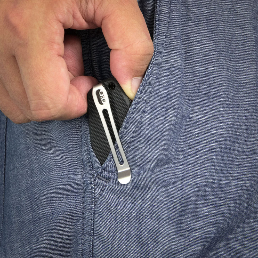 Stalowy klips zapewnia stabilne przenoszenie noża w kieszeni, zamocowanie w plecaku, sakwie, nerce itd., czym przyczynia się do minimalizacji ryzyka zgubienia narzędzia. Klips zaprojektowany w stylu deep carry, umożliwia dyskretne przenoszenie noża w kieszeni. Klips posiada możliwość montażu po obu stronach rękojeści, co ułatwia obsługę noża osobom prawo- i leworęcznym. Jest to klips typu tip-up, zlokalizowany na zakończeniu rękojeści noża umożliwiający przenoszenie ostrza wierzchołkiem do góry.NAZWA: Tityus