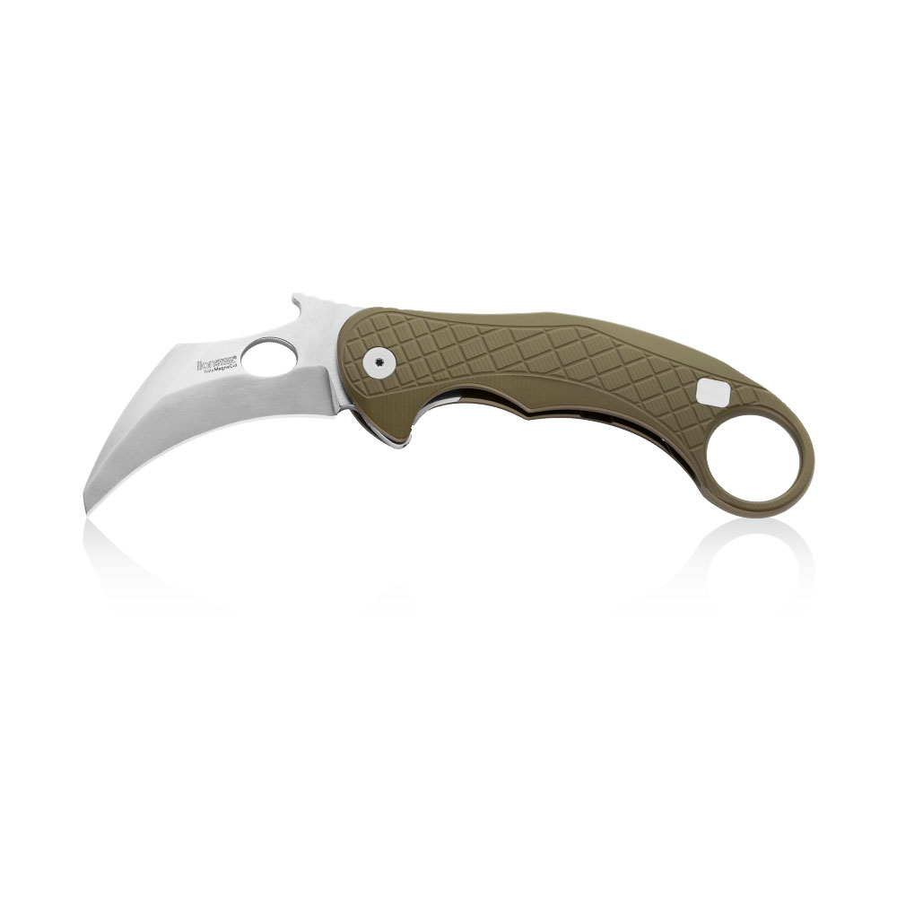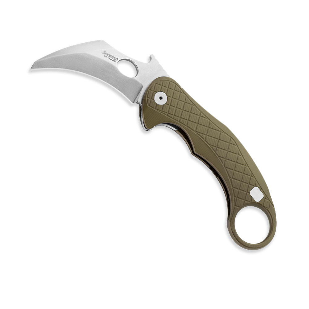- Ostrze: składane (folding knife), profil howkbill ze szlifem płaskim; gładka krawędź tnąca