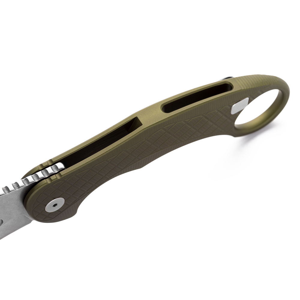 Otwieranie noża odbywa się za sprawą subtelnie wystającego z głowni, demontowalnego flippera (płetwa), otworu na palec lub Emerson Wave. Rozkładanie noża następuje bardzo swobodnie i płynnie dzięki wyposażeniu go w łożyska kulkowe. Nóż posiada stabilną i wytrzymałą blokadę zabezpieczającą przed przypadkowym zamknięciem typu frame lock. W listku blokady umieszczono stalową wkładkę dla zwiększenia żywotności mechanizmu blokującego. Wkładka posiada też specjalną wypustkę, która zapobiegać ma przed nadmiernym odciągnięciem blokady na zewnątrz rękojeści (overtravel stop).
