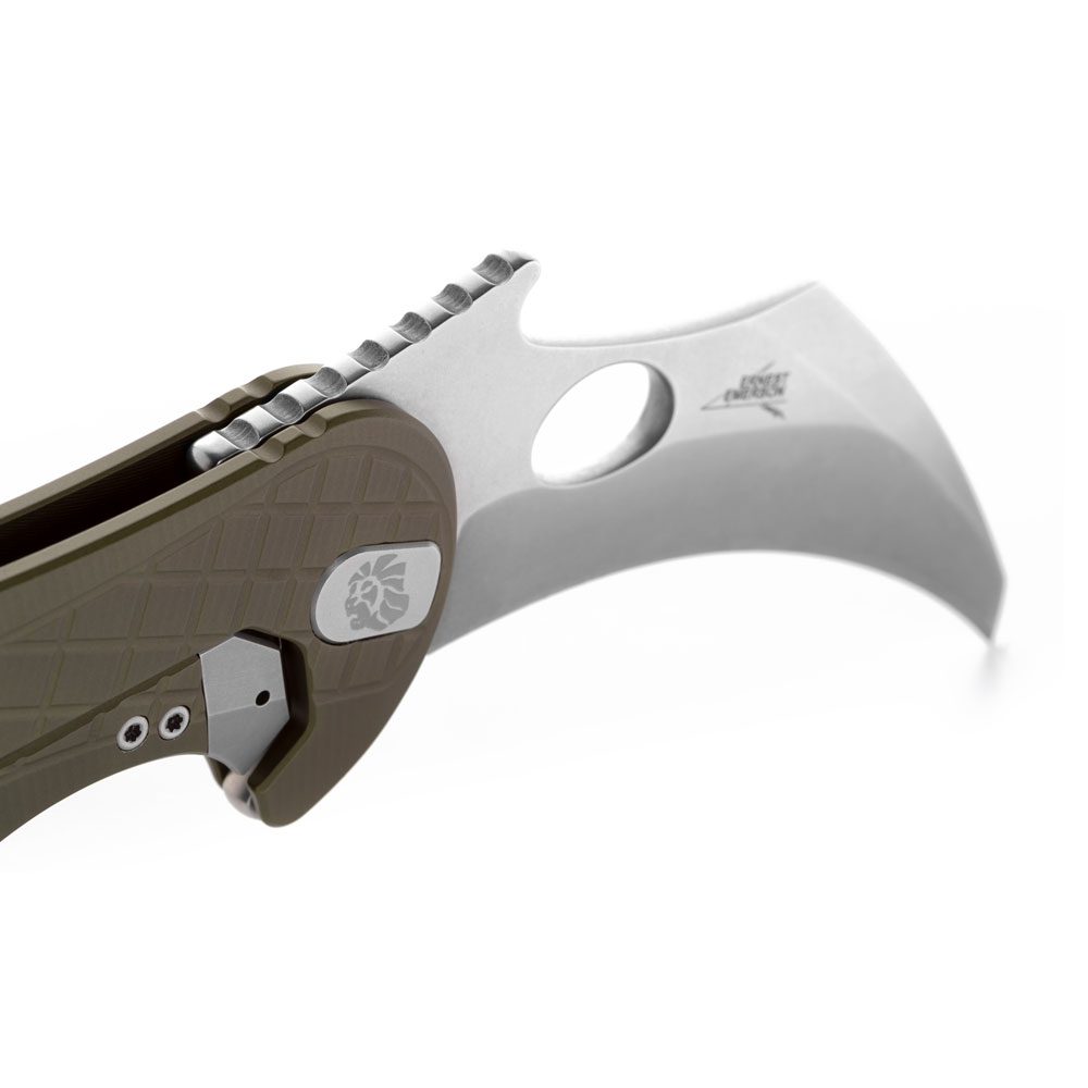 Noż składany LionSTEEL L.E.One LE1 A GS by Emerson Design | Karambit Stonewashed MagnaCut Green Aluminium to projekt bardzo się wyróżniający.