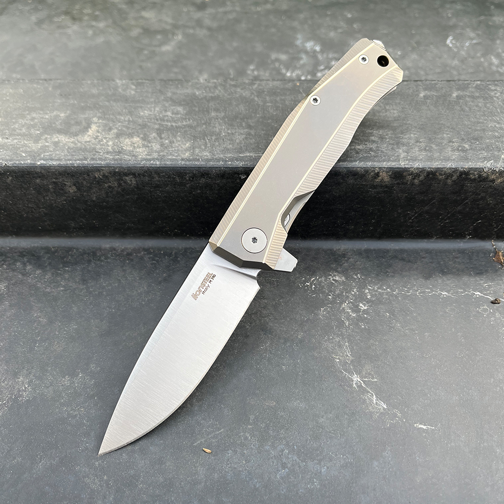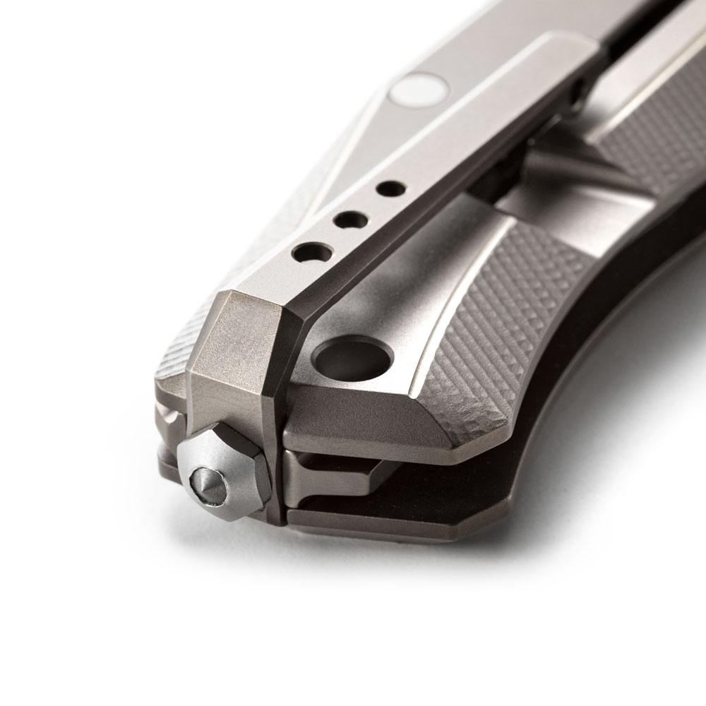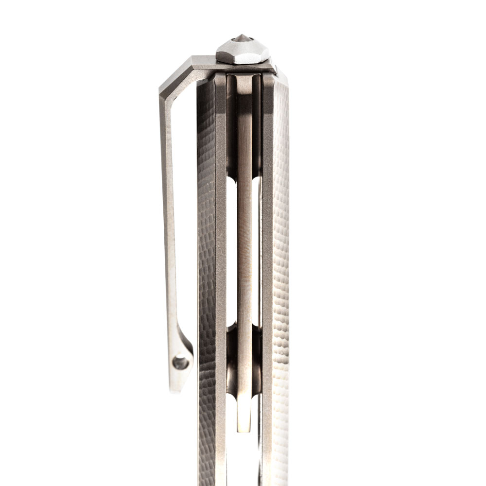 - Rękojeść: tytanowa (bronze titanium), frezowana, dwutonowa, tytanowy backspacer, obustronny tytanowy klips mocujący (Tip-Up)