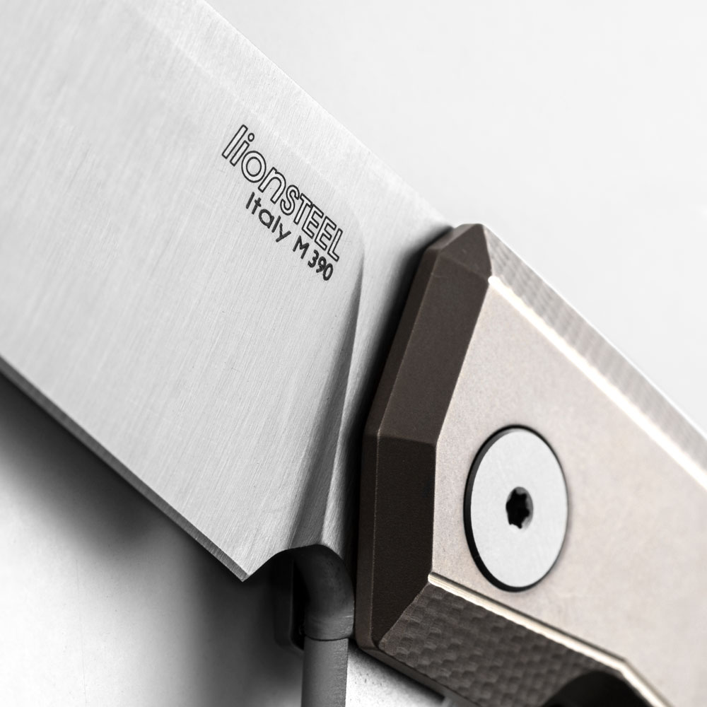 Ostrze noża wykonane zostało ze stali proszkowej M390. Jest to jedna z kilku stali dostępnych na rynku znajdujących się w absolutnym topie jakościowym materiałów służących do produkcji noży premium. Najlepsze jej właściwości uzyskuje się poprzez właściwe wykonanie procesu hartowania, w którym bezbłędnie muszą być przeprowadzone 3 etapy: utwardzanie, chłodzenie kriogeniczne (wymrażanie) i odpuszczanie. Właściwie przygotowane ostrze z M390 jest ekstremalnie wytrzymałe na przeciążenia, niezwykle długo pozostaje ostre (bardzo wolno się ściera) i ma doskonałe właściwości antykorozyjne.