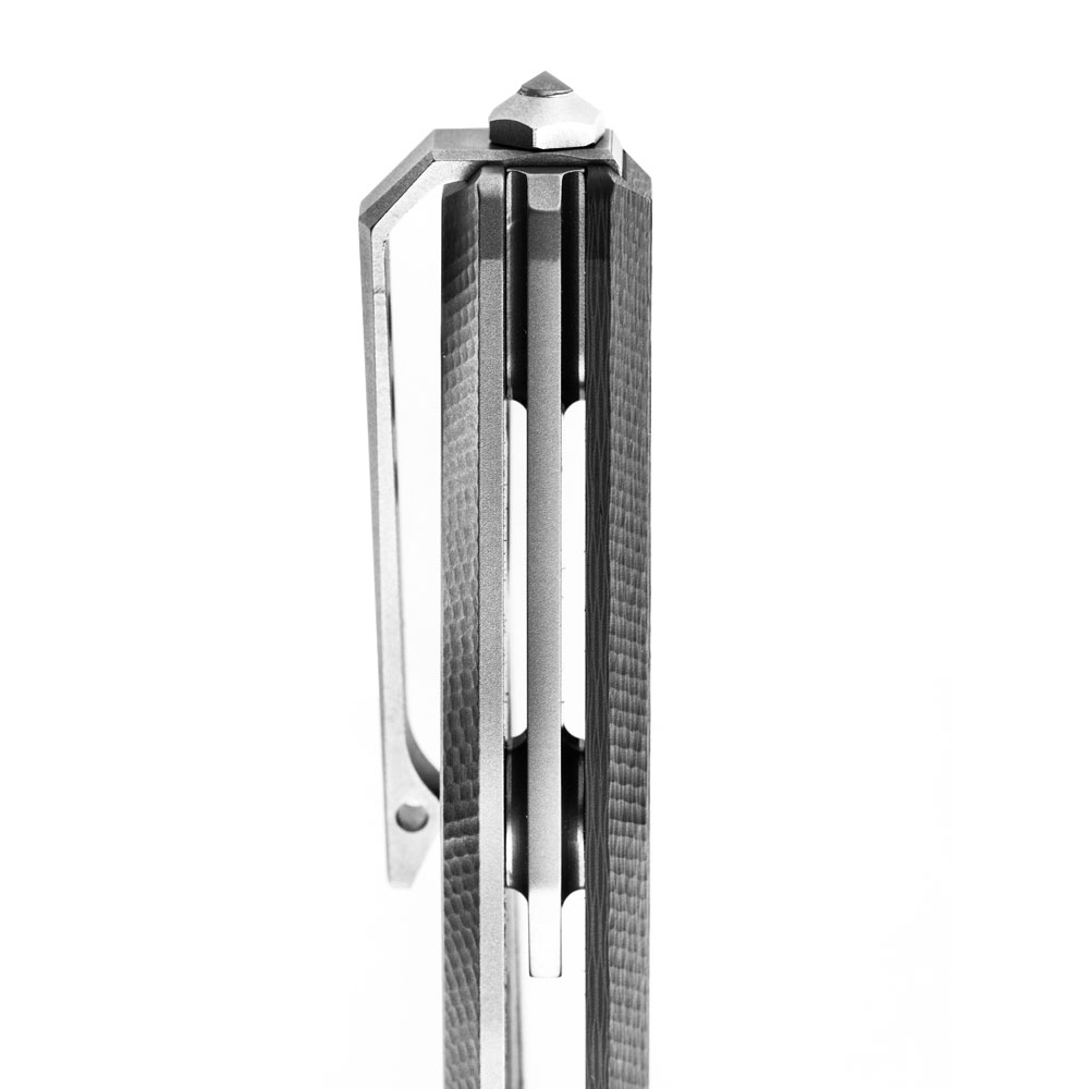 - Rękojeść: tytanowa, frezowana/włókno węglowe konturowane, tytanowy backspacer, obustronny tytanowy klips mocujący (Tip-Up)