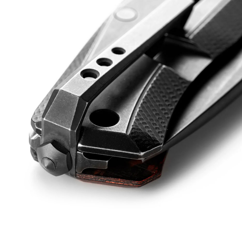 - Rękojeść: tytan z jednej strony, włókno węglowe FatCarbon z drugiej, frezowana, dwutonowa, tytanowy backspacer, obustronny tytanowy klips mocujący (Tip-Up)