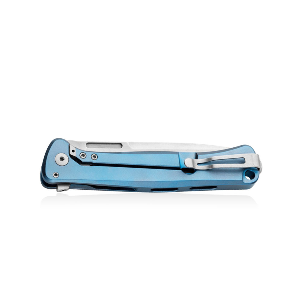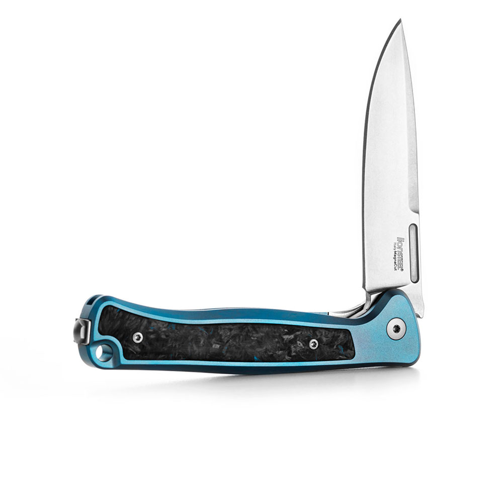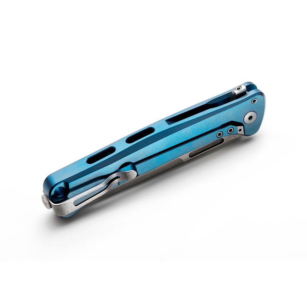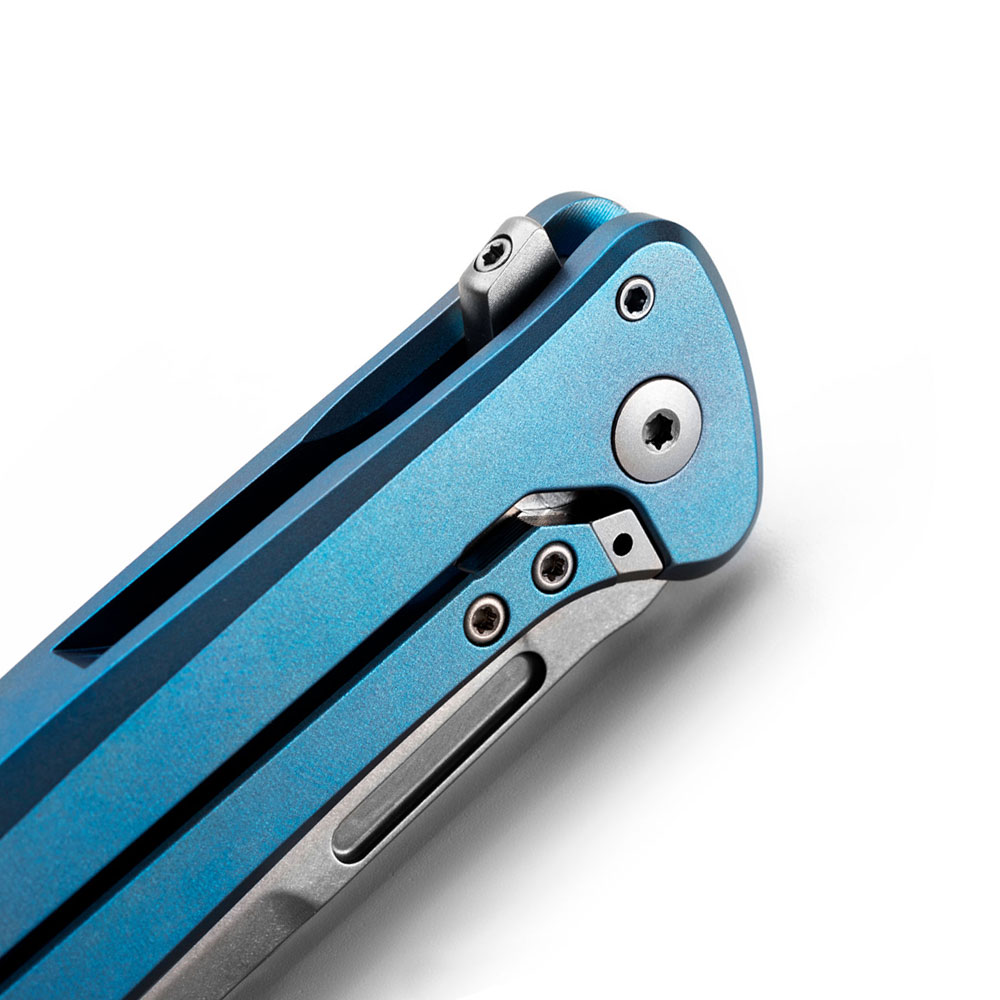 • Rękojeść: tytanowa (titanium 6AI4V), frezowana, kolor niebieski (blue), wstawka z włókna węglowego (carbon fiber), obustronny stalowy klips mocujący (Tip-Up, Deep Carry)