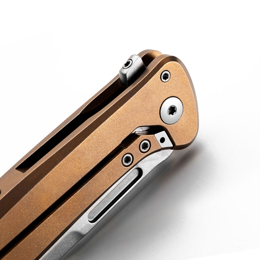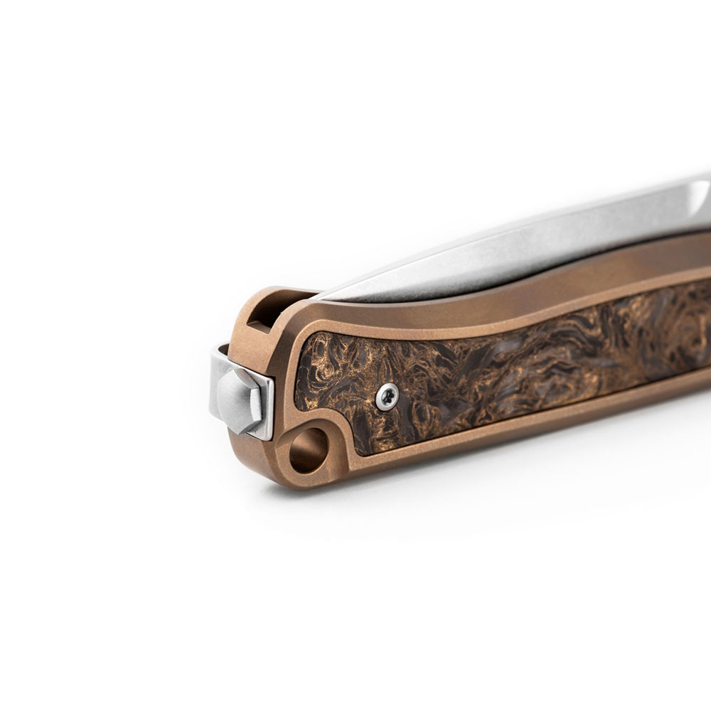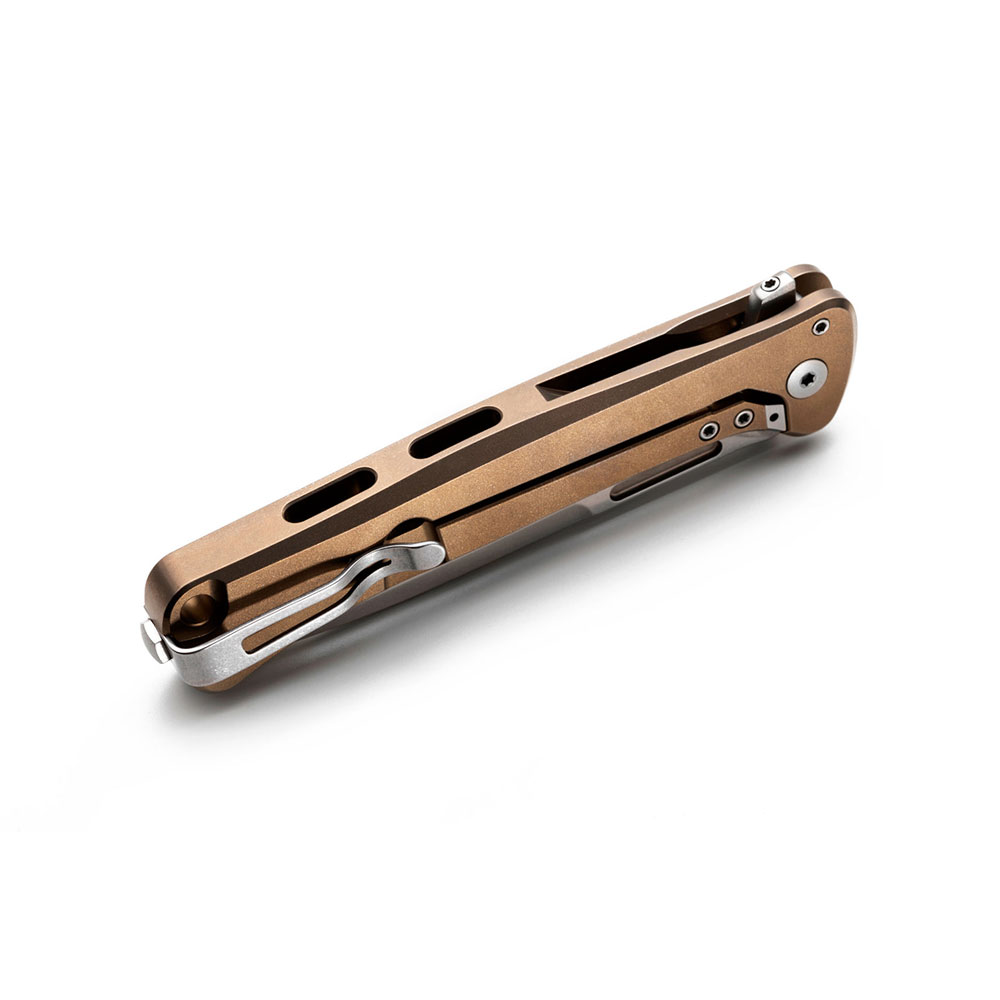 - Rękojeść: tytanowa (titanium 6AI4V), frezowana, kolor brązowy (bronze), wstawka z włókna węglowego (carbon fiber), obustronny stalowy klips mocujący (Tip-Up, Deep Carry)