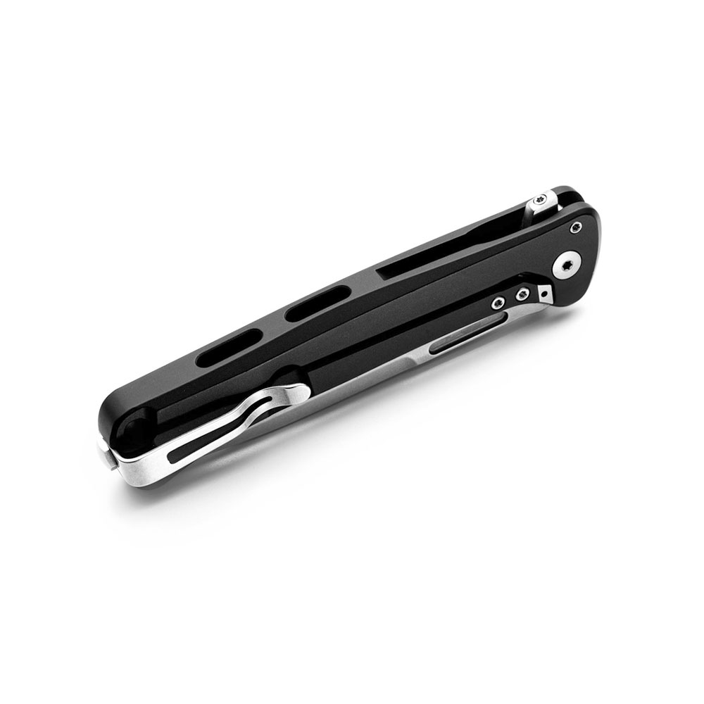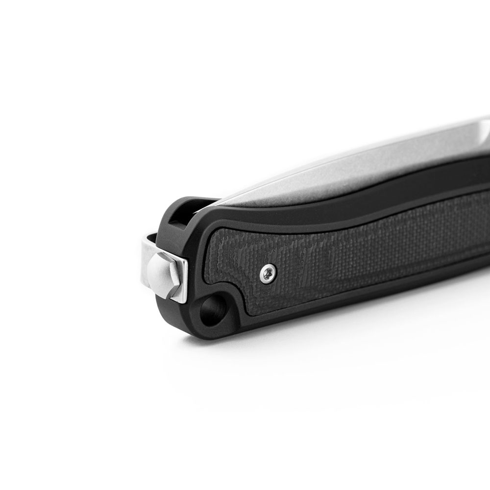 - Rękojeść: aluminiowa, frezowana, kolor czarny (black), wstawka z czarnej micarty, obustronny stalowy klips mocujący (Tip-Up, Deep Carry)