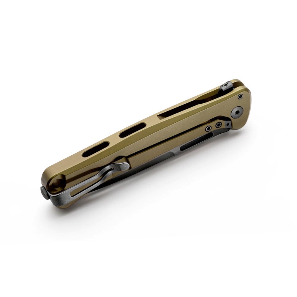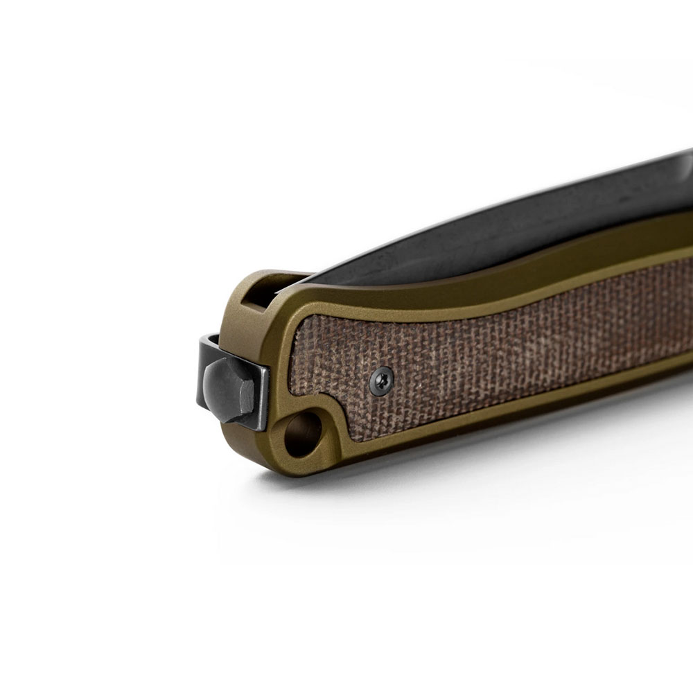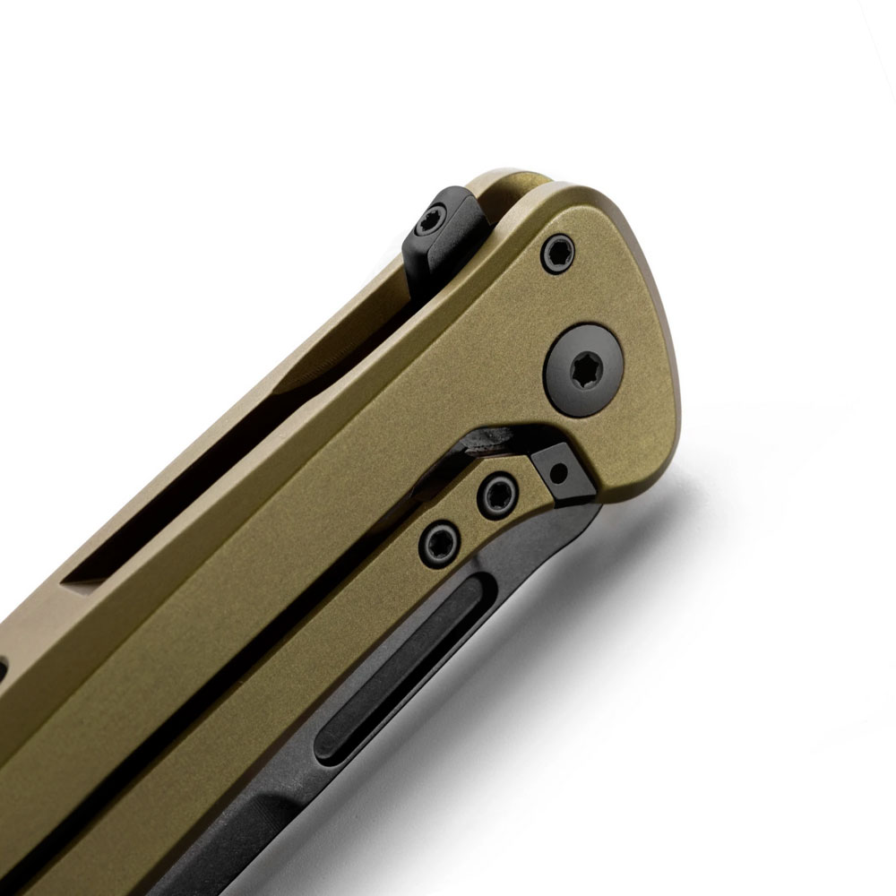 - Rękojeść: aluminiowa, frezowana, kolor zielony (green), wstawka z brązowej micarty, obustronny stalowy klips mocujący (Tip-Up, Deep Carry)