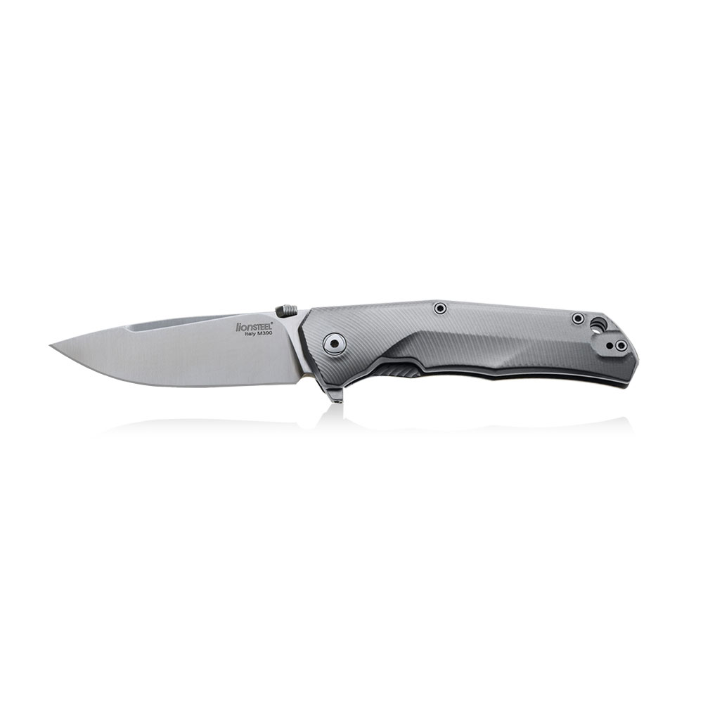 Noż składany LionSTEEL T.R.E. TRE GY Gray Titanium by Molletta posiada głownię typu drop point z pełnym szlifem płaskim, wykonaną ze stali premium M390. Głownię otwierania płetwa (flipper) lub kołkiem/dyskiem, które można zdemontować, aby nóż otwierać oburącz, w sposób tradycyjny. Rękojeść wykonana została z tytanu. Za blokowanie ostrza odpowiada blokada typu frame lock z wkładką stalową a wygodne przenoszenie noża umożliwia tytanowy, przekładalny klips.
