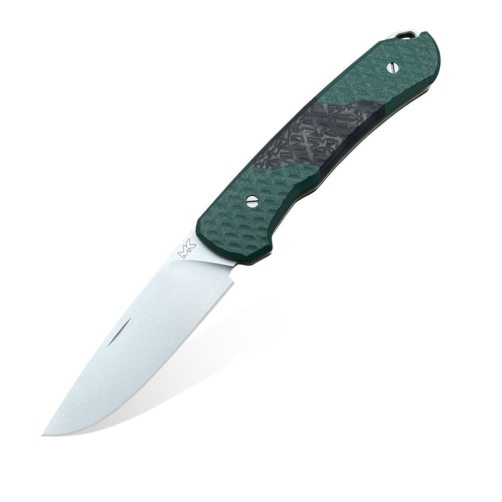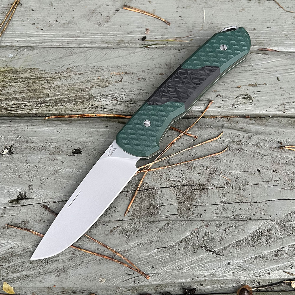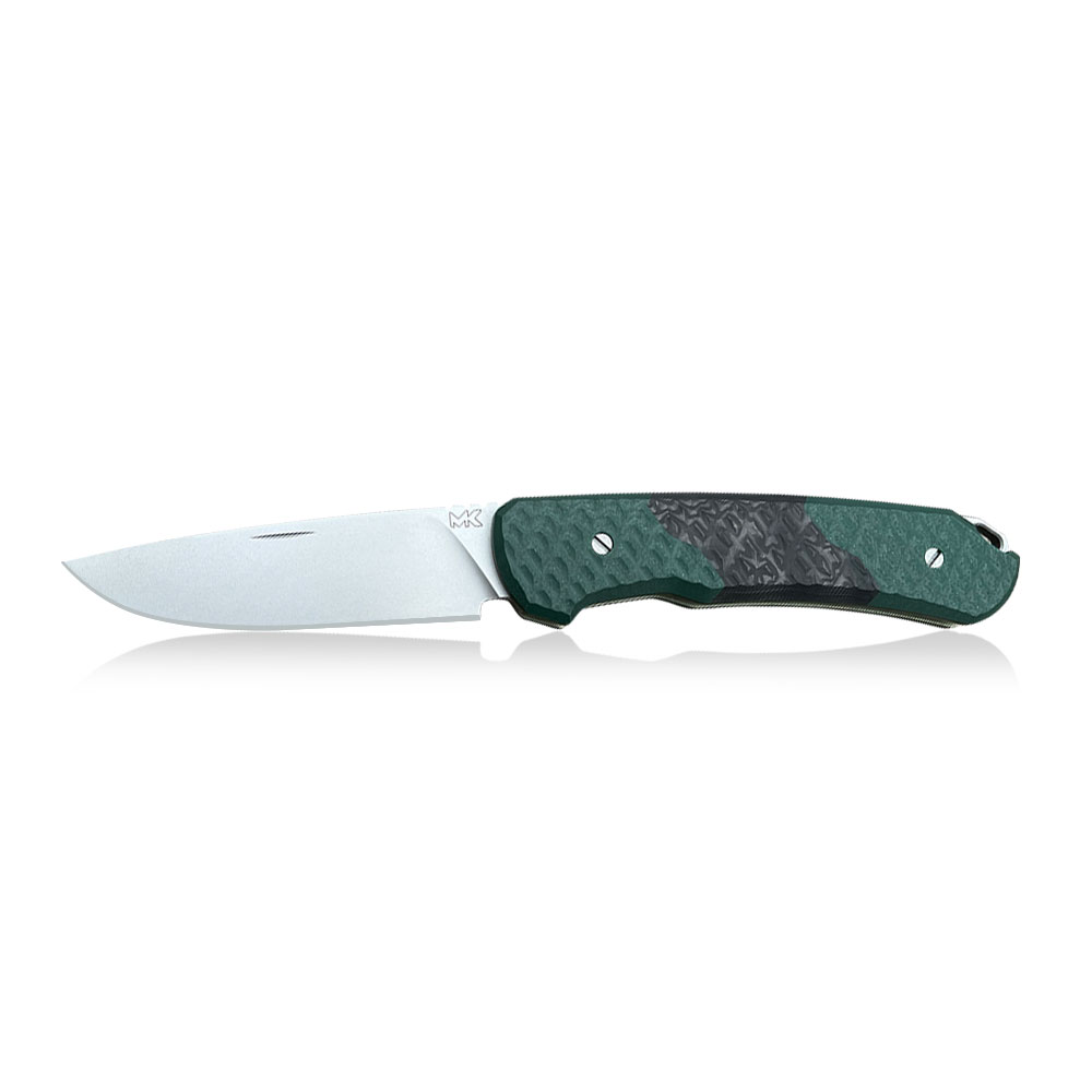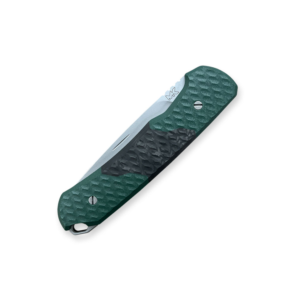 Nóż składany MK Knives & Tools Humbler „Black Wave #2” posiada piaskowane (sandblasted) ostrze ze stali Elmax, rękojeść z zielonego kompozytu G-10 (green) z wstawką z czarnego, urozmaiconego drobnymi wzorami epoksydu. Okładziny rękojeści osadzone zostały na tytanowych linersach anodyzowanych na kolor zielony a backspacer wykonany został ze stali Elmax z piaskowanym wykończeniem. W zestawie otrzymujemy nóż oraz materiałowy pouch MK.