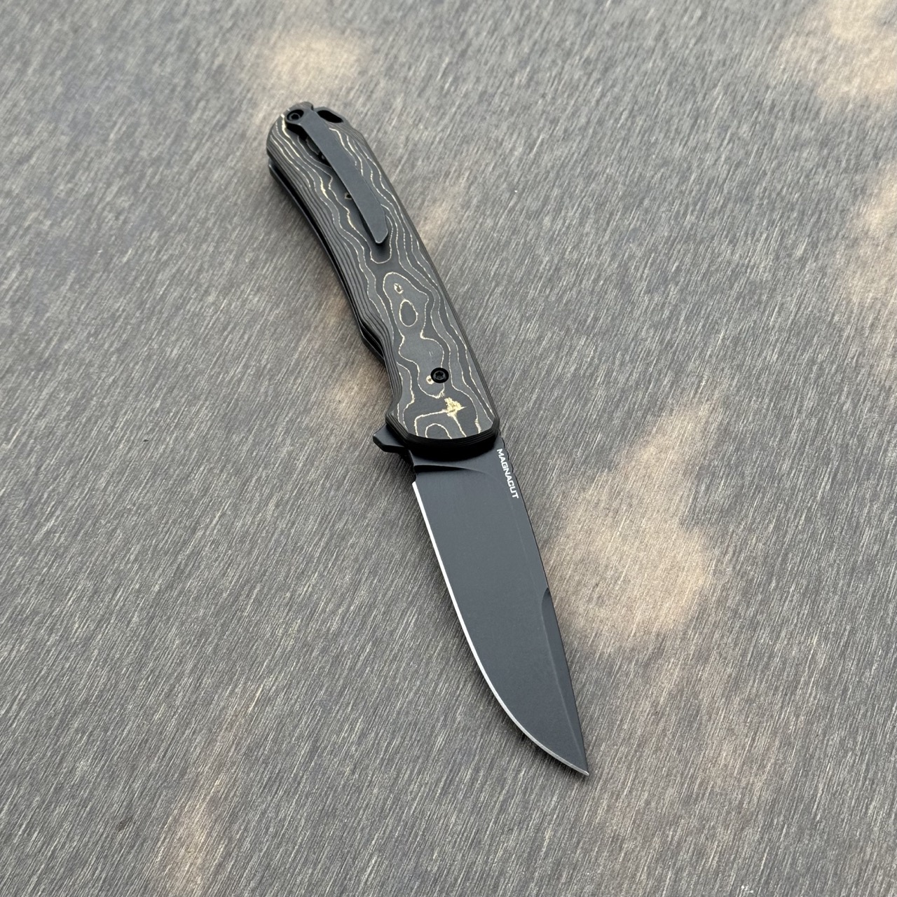 Nóż składany MK Knives & Tools Humbler “CAMO Gold” Black Stonewashed MagnaCut – Limited FatCarbon Series | Zestaw kolekcjonerski