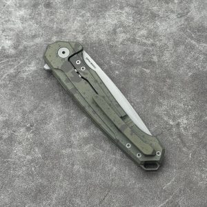 **OTWIERANIE FLIPPER’EM**: Nóż otwieramy flipperem (klasyczną płetwą). Otwieranie następuje gładko dzięki wyposażeniu noża w ceramiczne łożyska kulkowe. Flipper pełni rolę bezpieczeństwa, po otwarciu noża stając się faktycznie jelcem zapobiegającym zsunięciu się dłoni na krawędź tnącą.