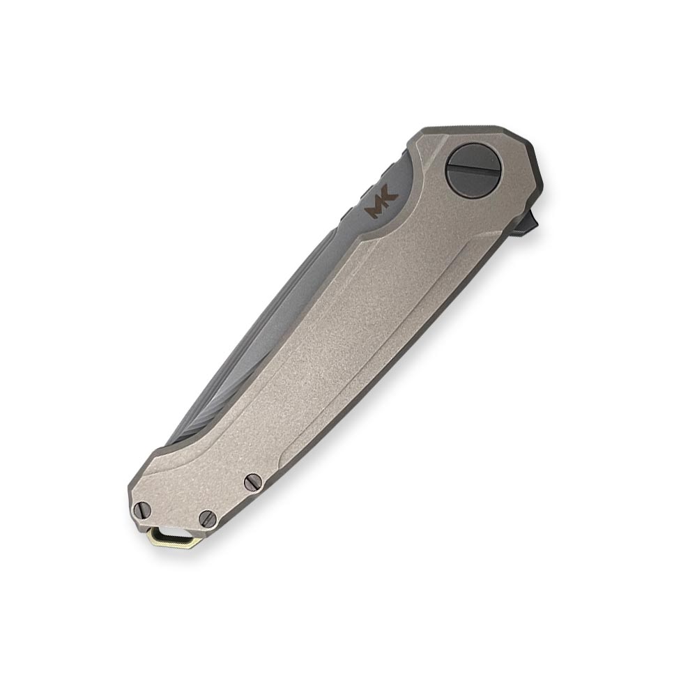 Rękojeść w całości wykonana została z lekkiego i ekstremalnie wytrzymałego tytanu (szara anodyzacja). Jest to twardy, odporny na uderzenia i uszkodzenia mechaniczne metal, stosowany w nożach z najwyższej półki jakościowej. Jest odporny na korozję. Okładki skręcone zostały śrubami ze stali nierdzewnej w powłoce PVD w kolorze spójnym z całością projektu. Nóż wyposażono w tytanowy, anodyzowany na zielono klips, umożliwiający stabilne przenoszenie w kieszeni, zamocowanie w plecaku, organizerze, nerce itd. Nóż posiada wkładkę dystansową tzw. backspacer z tytanu kolorystycznie dopasowany do klipsa. Backspacer kończy się otworem pozwalającym na przewleczenie dodatkowej linki, paracordu itp. Zarówno klips jak i otwór to elementy służące jako ewentualne zabezpieczenie przed zgubieniem noża. Otwór można wykorzystać również do podpięcia dodatkowej ozdoby w postaci koralika (po koraliki MK zapraszamy TUTAJ).