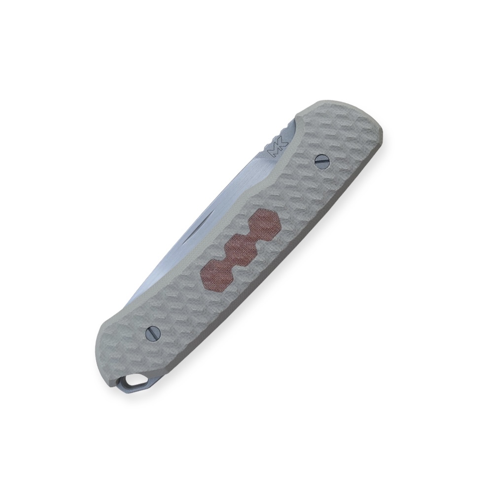 Okładziny rękojeści wykonane z kompozytu G10 z wstawką z micarty posiadają chropowatą strukturę dla lepszej chwytności. Sam G10 jest odporny na wilgoć, zmiany temperatury, większość rozpuszczalników i kwasów, posiada wysoką odporność na uszkodzenia mechaniczne. Okładki skręcone zostały śrubami ze stali nierdzewnej w kolorze spójnym z całością projektu. W backspacerze zaprojektowany został otwór pozwalający na przewleczenie dodatkowej linki, paracordu itp. służących jako zabezpieczenie przed ewentualnym zgubieniem noża. Otwór można wykorzystać również do podpięcia dodatkowej ozdoby w postaci koralika (po koraliki MK zapraszamy TUTAJ).