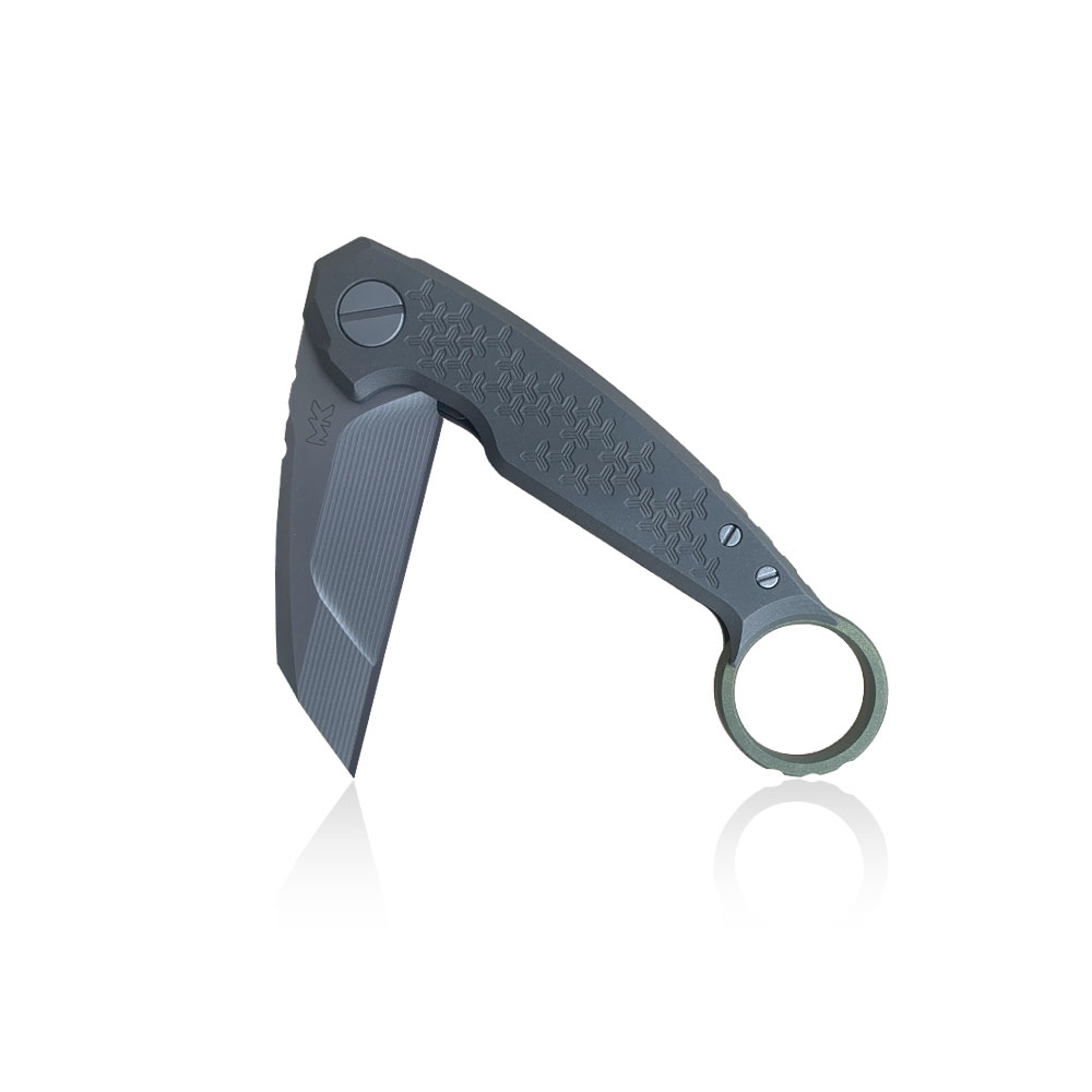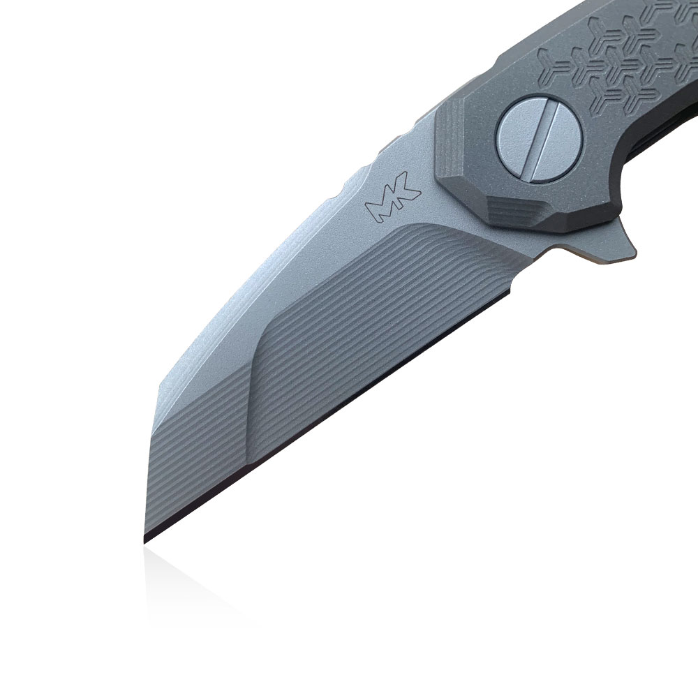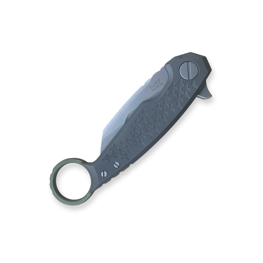 Rękojeść w całości wykonana została z lekkiego i ekstremalnie wytrzymałego tytanu (pisakowany tytan). Jest to twardy, odporny na uderzenia i uszkodzenia mechaniczne metal, stosowany w nożach z najwyższej półki jakościowej. Jest odporny na korozję. Okładki skręcone zostały śrubami ze stali nierdzewnej (szkiełkowane) w kolorze spójnym z całością projektu. Nóż wyposażono w tytanowy klips, umożliwiający stabilne przenoszenie w kieszeni, zamocowanie w plecaku, organizerze, nerce itd. Nóż posiada wkładkę dystansową tzw. backspacer z tytanu, w którym zaprojektowany został otwór pozwalający na przewleczenie dodatkowej linki, paracordu itp. Zarówno klips jak i otwór to elementy służące jako zabezpieczenie przed ewentualnym zgubieniem noża. Otwór można wykorzystać również do podpięcia dodatkowej ozdoby w postaci koralika (po koraliki MK zapraszamy TUTAJ).