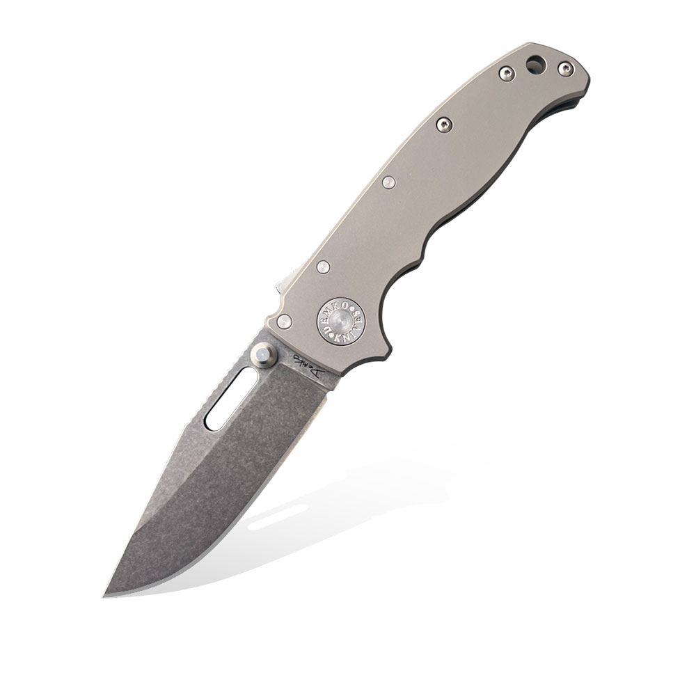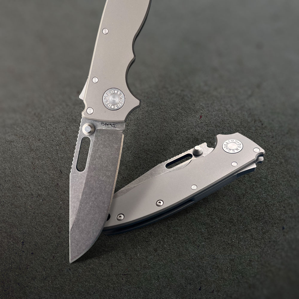 - Rękojeść: stalowe linersy, tytanowe okładki, tytanowy backspacer , tytanowy klips