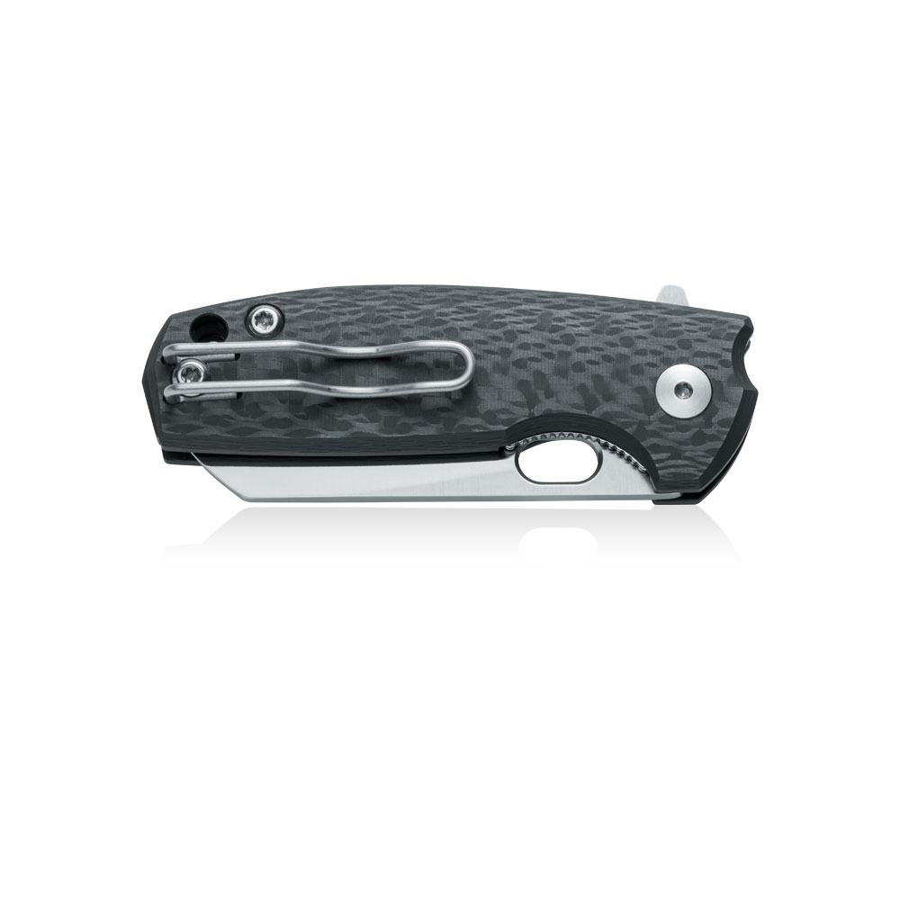 Klips mocujący w stylu Tip-Up i Deep Carry zlokalizowany na zakończeniu rękojeści noża umożliwia przenoszenie zamkniętego ostrza wierzchołkiem do góry oraz dyskretne przenoszenie całości w kieszeni. Klips wykonany został z drutu ze stali nierdzewnej (bead blasted AISI 302 Stainless Steel). Klips pasuje świetnie do koncepcji ultralekkiego foldera (całość wazy tylko 70 gramów). Może być montowany i na prawej i lewej stronie.