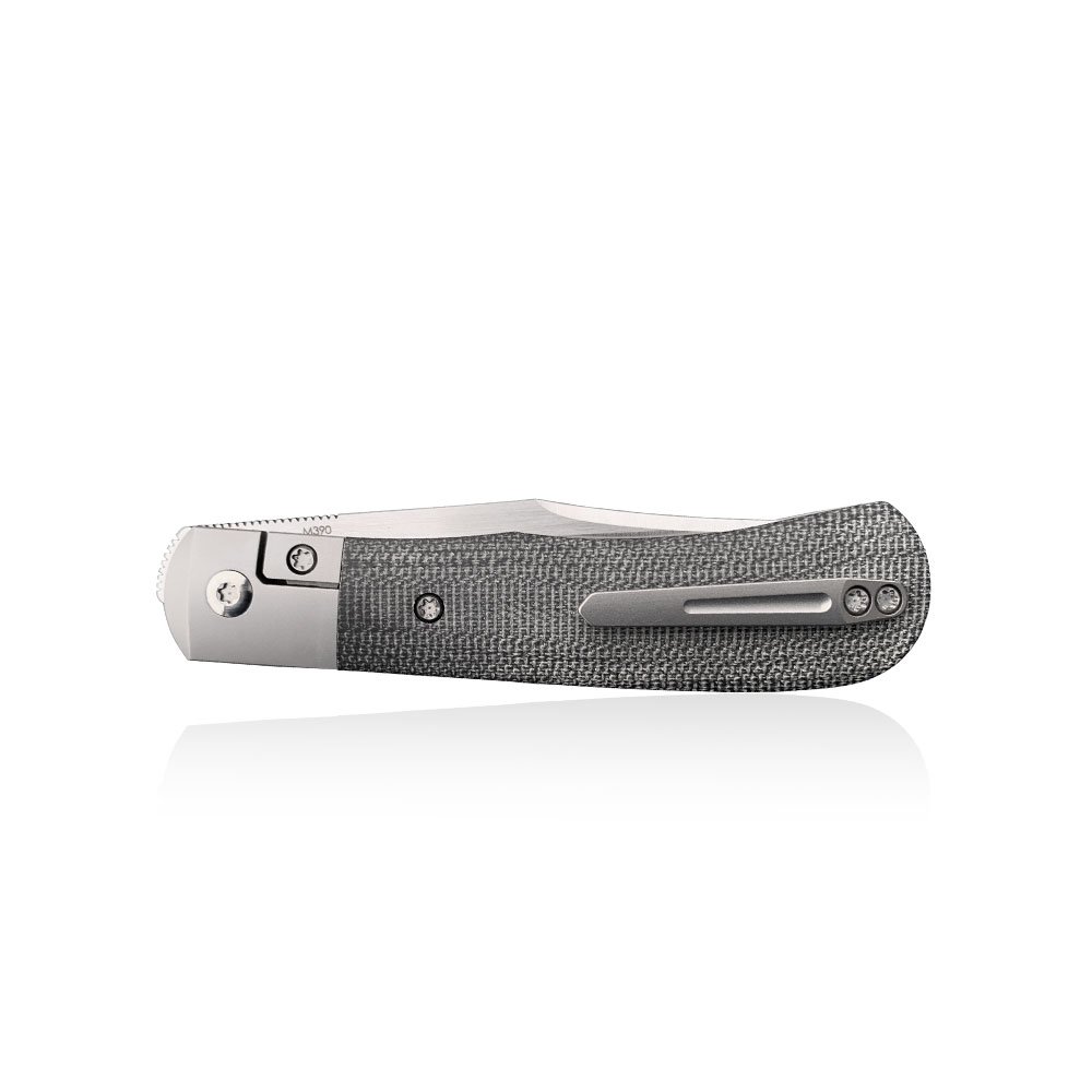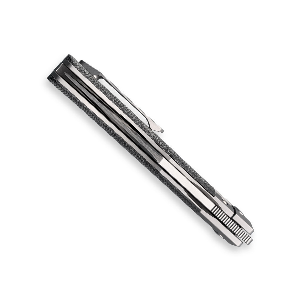 Klips mocujący w stylu Tip-Up zlokalizowany na zakończeniu rękojeści noża umożliwia przenoszenie zamkniętego ostrza wierzchołkiem do góry. Klips wykonany został z tytanu.
