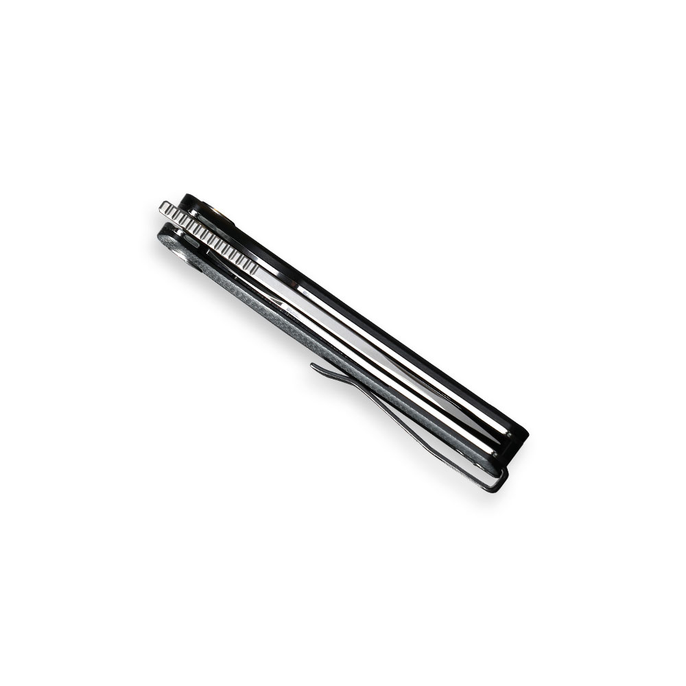 Tytanowy klips mocujący zapewnia stabilne przenoszenie noża w kieszeni, zamocowanie w plecaku, sakwie, nerce itd., czym przyczynia się do minimalizacji ryzyka zgubienia narzędzia. Klips można montować po obudwu stronach rękojeści dla łatwości użytkowania przez osoby prawo i leworęczne. Klips posiada konstrukcję deep carry tzn. umożliwia schowanie przyczepionego noża głęboko w kieszeni i dyskretne przenoszenie. Dla łatwości w identyfikacji na klipsie naniesiono nazwę noża. W tylnej części noża, w miejscu w którym kończy się backspacer umiejscowiono otwór na podpięcie paracordu, smyczy lub ozdoby do noża (do dokupienia TUTAJ).