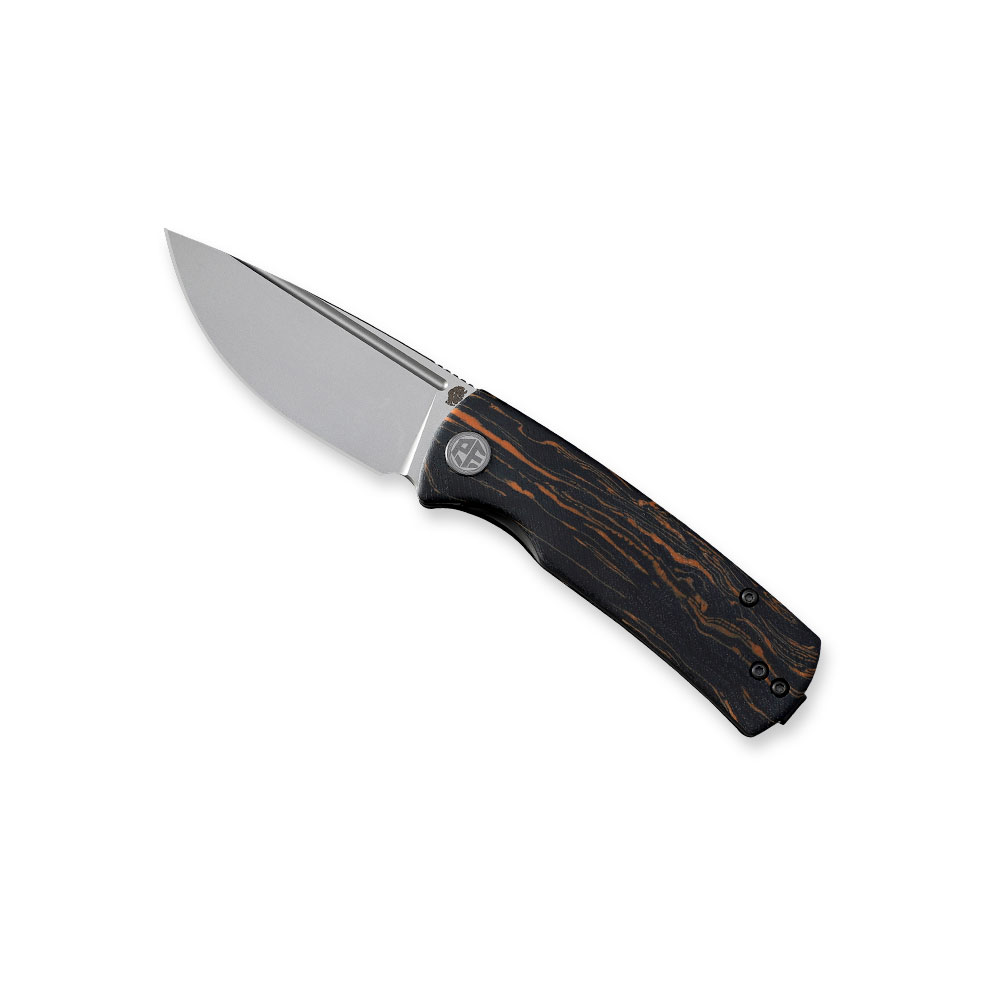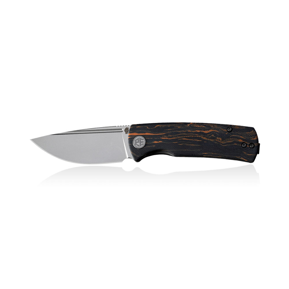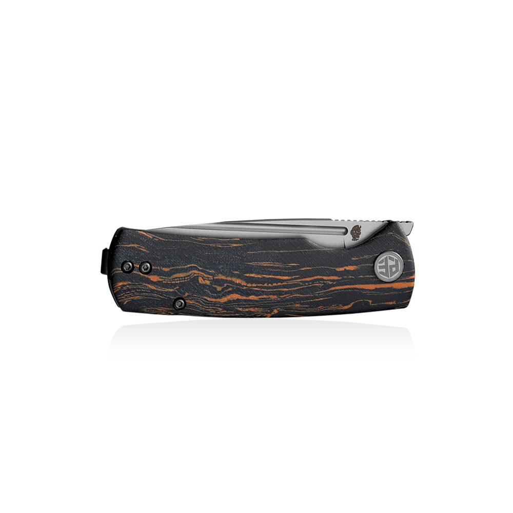 Nóż składany Petrified Fish Beluga Mini PF-P01X ODMP Orange Damask Pattern posiada wydajne ostrze typu drop point ze stali 14C28N. Rękojeść noża wykonana została z kompozytu G10 uformowanego we wzór typu damast (kolorystyka pomarańczowo-czarna). Designu noża dopełnia backspacer z G10 oraz tytanowy klips mocujący. Otwieranie noża następuję za sprawą wystającej górnej płetwy (front flipper) a ostrze blokuje blokada typu liner lock.