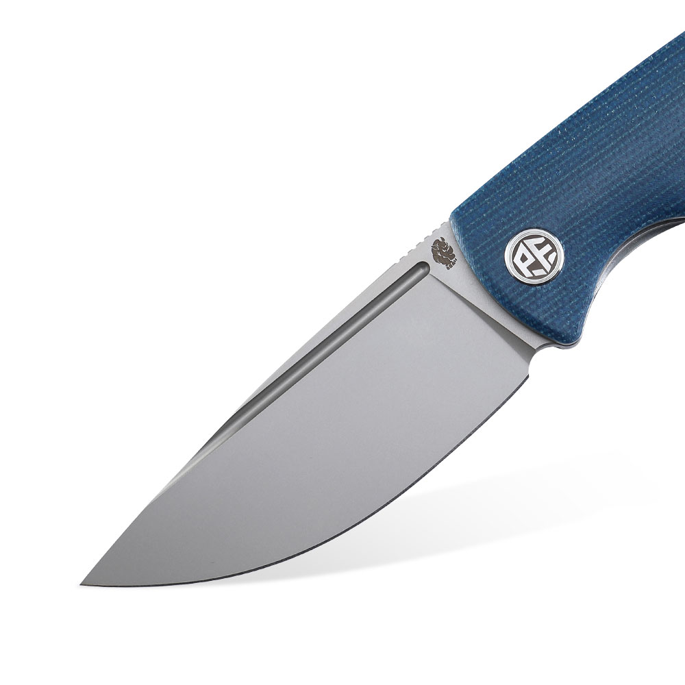 Nóż składany Petrified Fish Beluga PF-P01 BMP Blue Micarta posiada wydajne ostrze typu drop point ze stali K110. Rękojeść noża wykonana została z niebieskiej micarty. Designu noża dopełnia backspacer z G10 oraz stalowy klips mocujący. Otwieranie noża następuję za sprawą wystającej górnej płetwy (front flipper) a ostrze blokuje blokada typu liner lock.