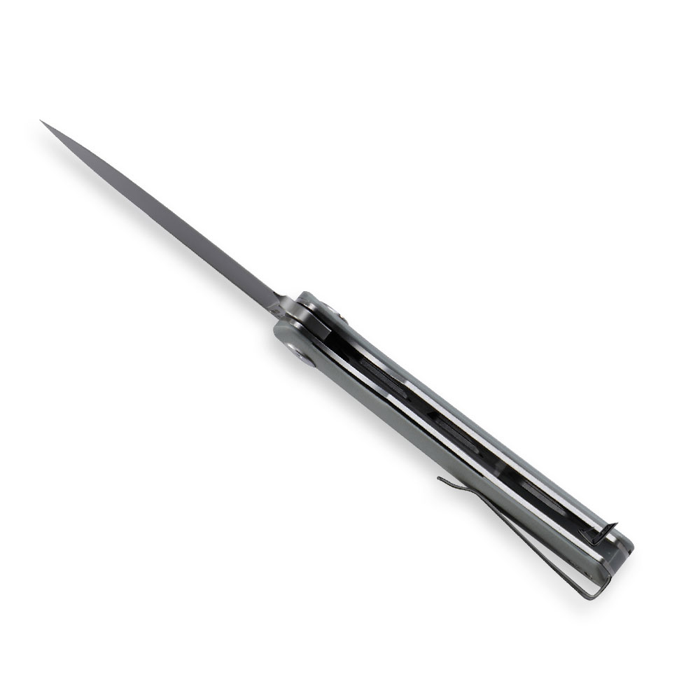 Nóż składany Petrified Fish Beluga PF-P01 Grey posiada wydajne ostrze typu drop point ze stali K110. Rękojeść noża wykonana została z szarego kompozytu G10. Designu noża dopełnia backspacer z G10 oraz stalowy klips mocujący. Otwieranie noża następuję za sprawą wystającej górnej płetwy (front flipper) a ostrze blokuje blokada typu liner lock.