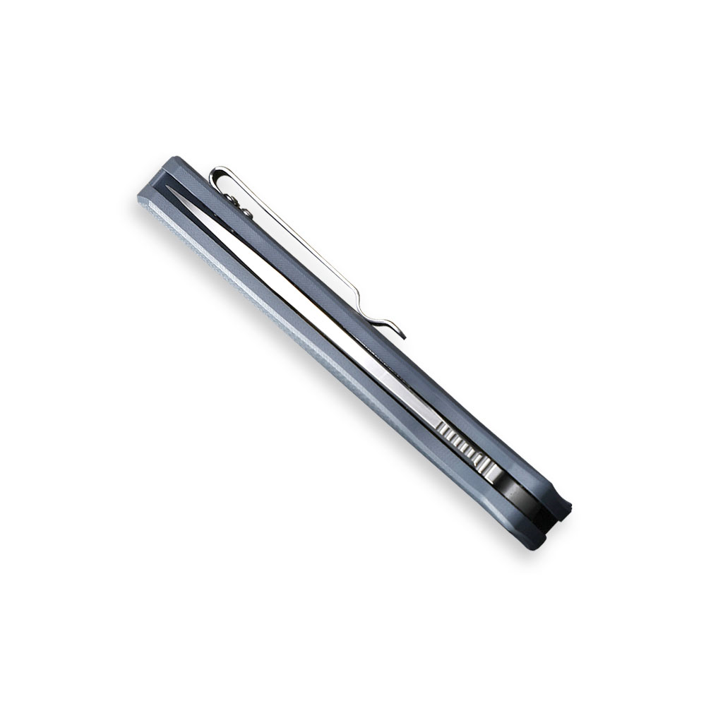 Stalowy klips ze stali nierdzewnej zapewnia stabilne przenoszenie noża w kieszeni, zamocowanie w plecaku, sakwie, nerce itd., czym przyczynia się do minimalizacji ryzyka zgubienia narzędzia. Klips zaprojektowany w stylu pasującym do całości projektu ozdobiony został podpisem designer’a. W rękojeści zaprojektowano otwór na paracord, linkę itp. rozwiązania zapobiegające przed zgubieniem lub upuszczeniem zabezpieczonego nimi narzędzia. Do otworu można również doczepić ozdobny koralik itd. (koralik nie znajduje się w zestawie).