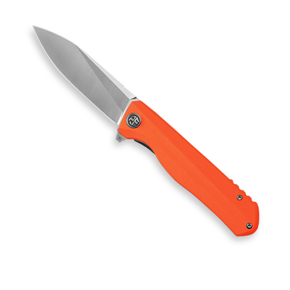 Nóż składany Petrified Fish Forward PF-818 OS Orange Satin posiada wydajne ostrze typu drop point ze znanej z efektywności cięcia i nieuciążliwej w ostrzeniu i pielęgnacji stali D2. Rękojeść noża wykonana została z pomarańczowego kompozytu G10. Otwieranie noża następuję za sprawą wystającej płetwy (flipper) a ostrze blokuje blokada typu liner lock.