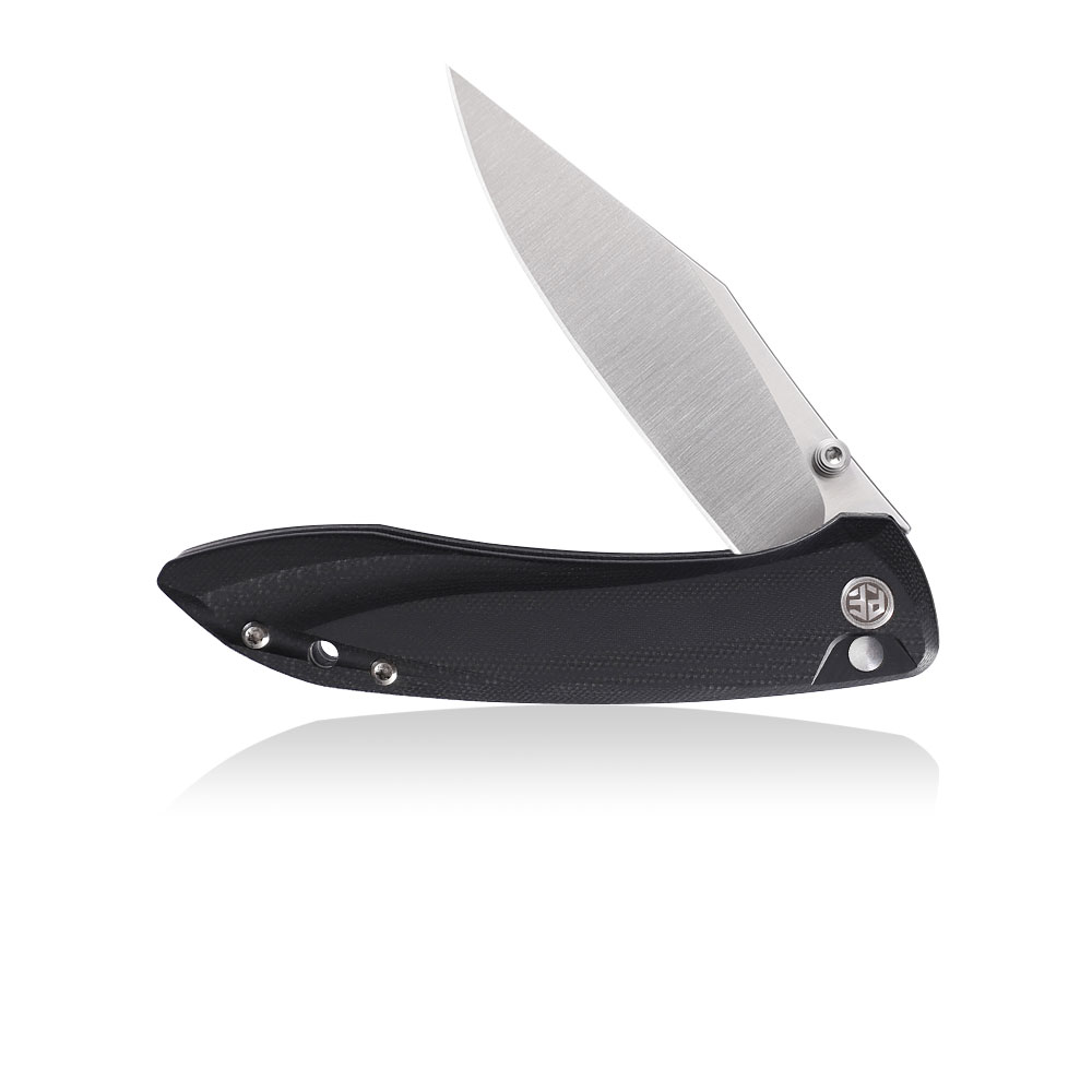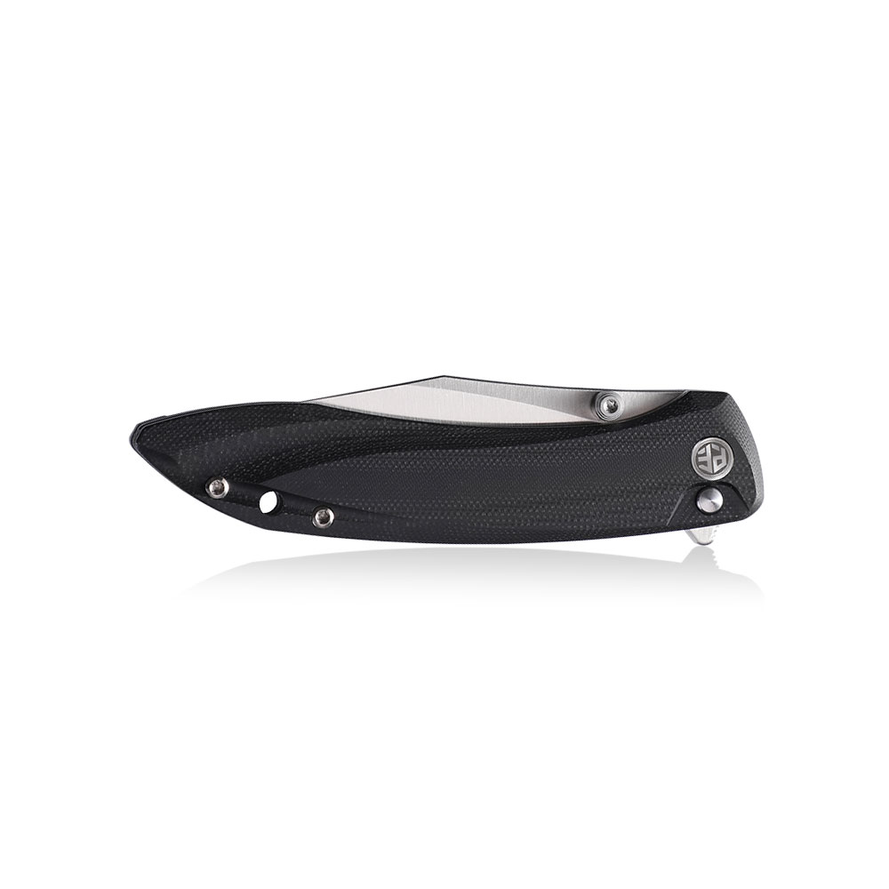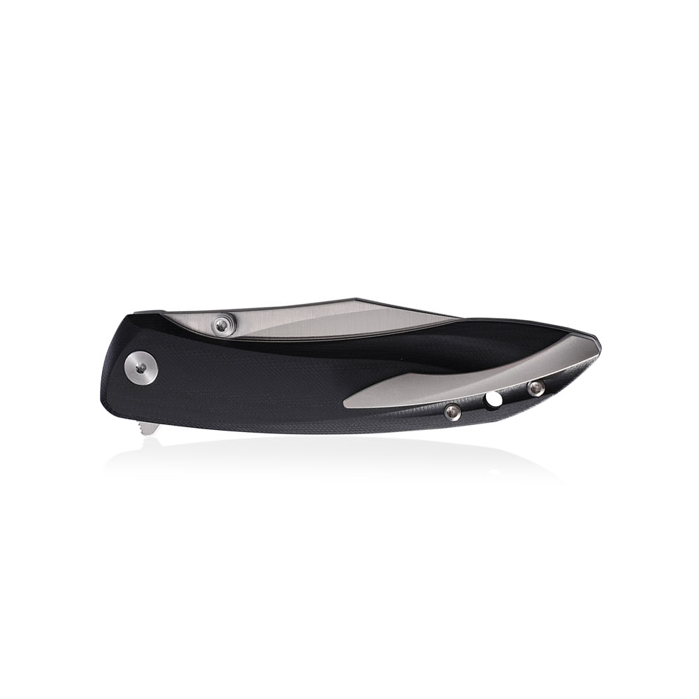 Wykonanie wyróżnia ostrze ze stali K110 otwierane kołkiem lub flipperem, okładki rękojeści z czarnego G10, klips tytanowy oraz blokada button lock.