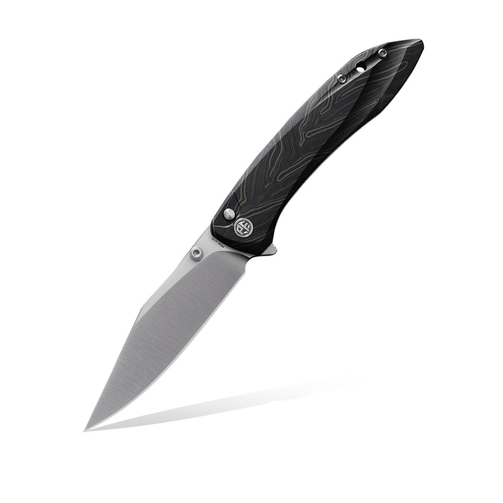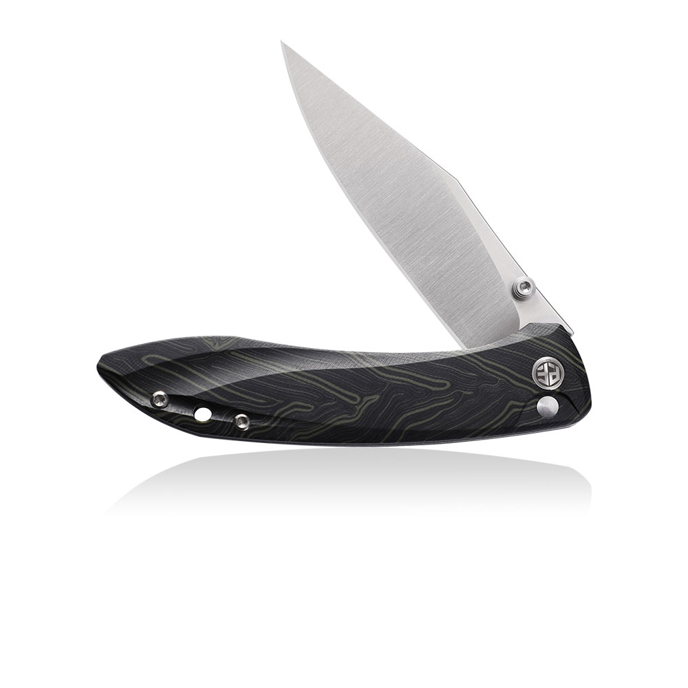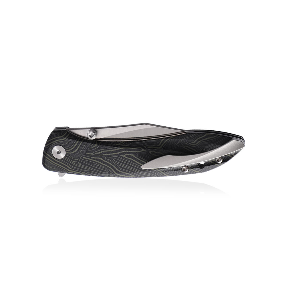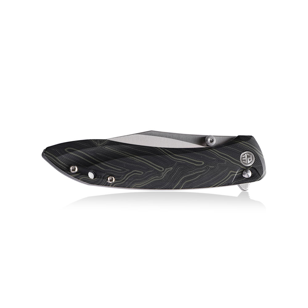 Wykonanie wyróżnia ostrze ze stali K110 otwierane kołkiem lub flipperem, okładki rękojeści z Green Gmascuss G10, klips tytanowy oraz blokada button lock.