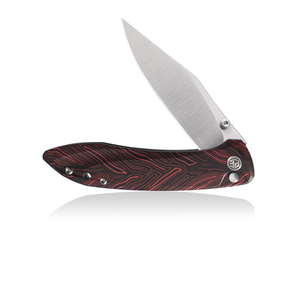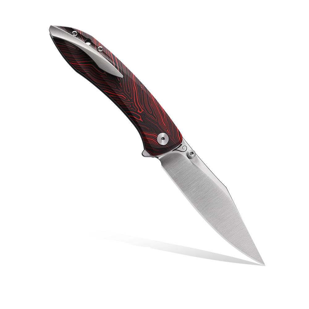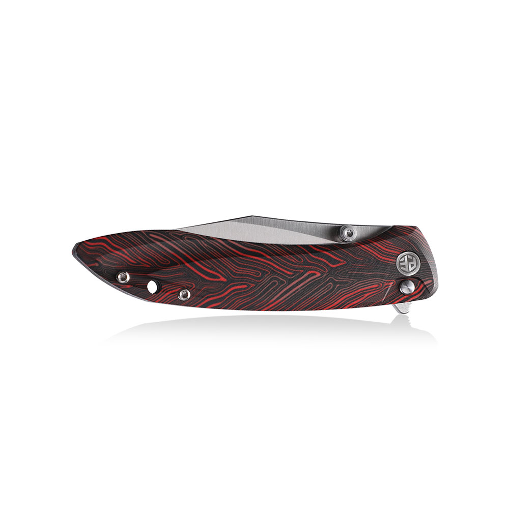 Wykonanie wyróżnia ostrze ze stali K110 otwierane kołkiem lub flipperem, okładki rękojeści z Red Gmascuss G10, klips tytanowy oraz blokada button lock.