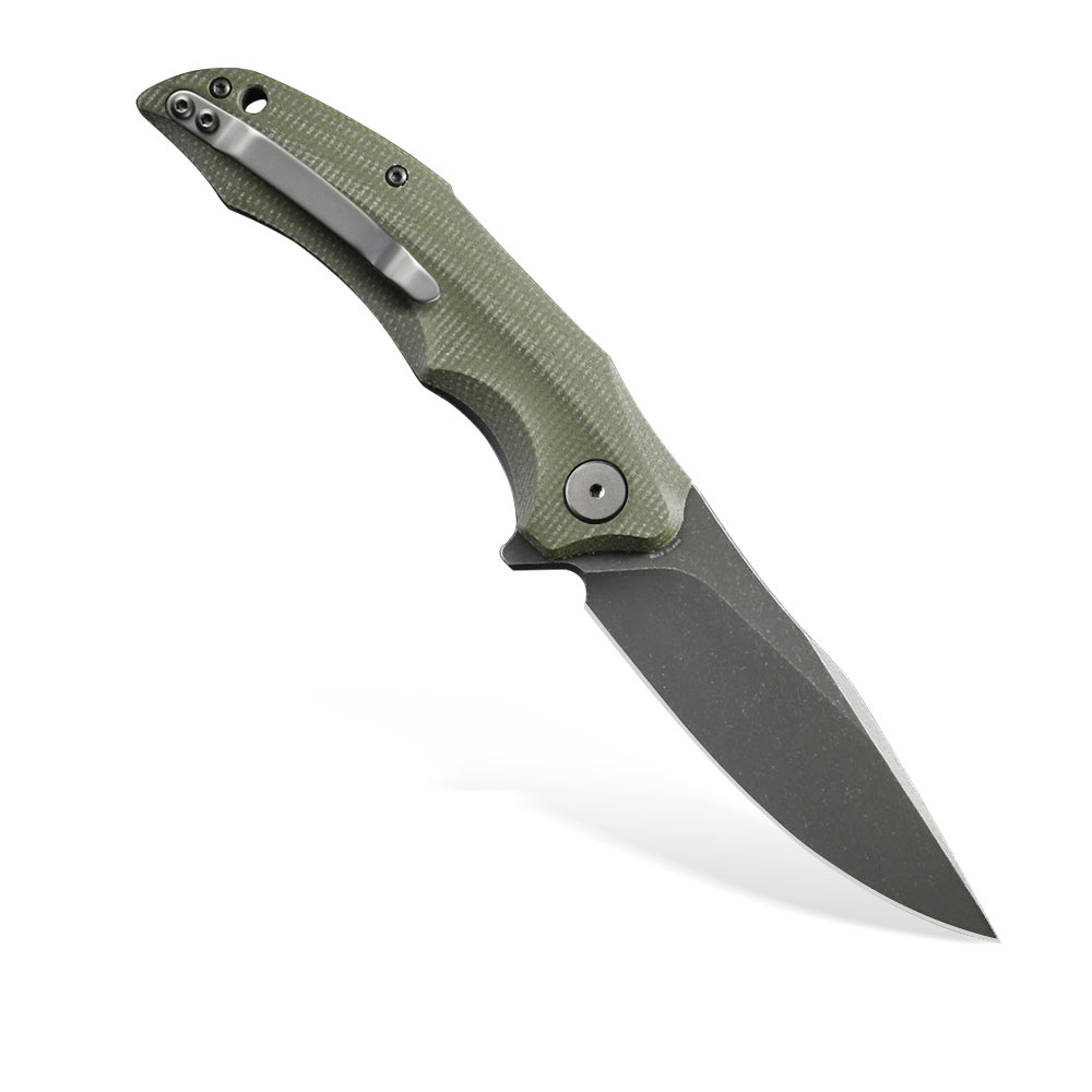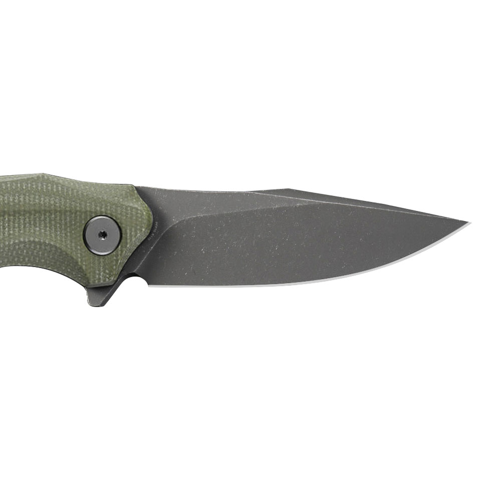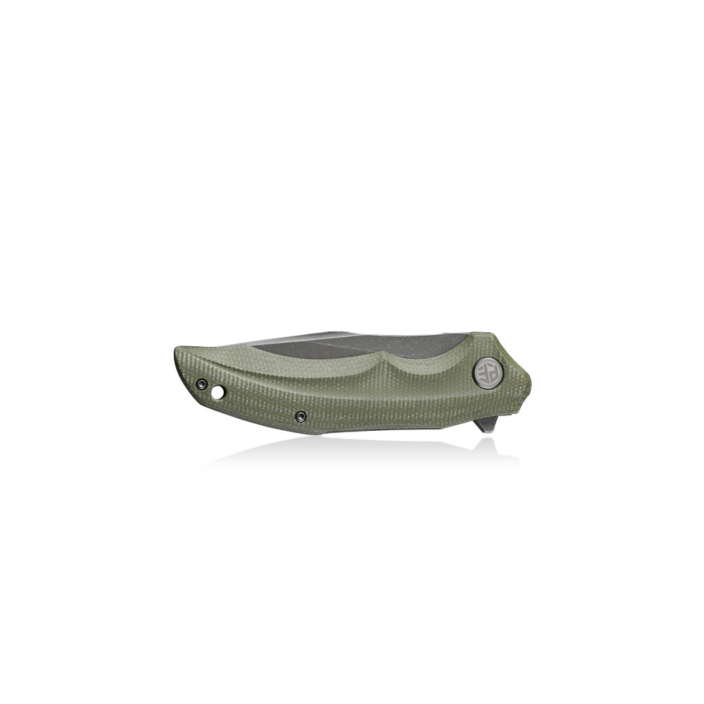 - Rękojeść: zielona micarta (green micarta), stalowe linersy, okładki i backspacer z G10, klips stalowy (Tip-Up)