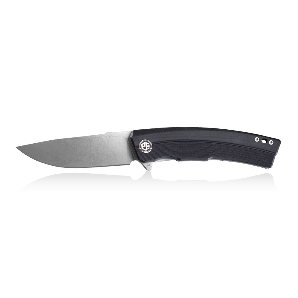 Nóż składany Petrified Fish Magazine PF-P02DW Black Stonewash posiada wydajne ostrze typu drop point ze znanej z efektywności cięcia i nieuciążliwej w ostrzeniu i pielęgnacji stali D2. Rękojeść noża wykonana została z czarnego kompozytu G10. Otwieranie noża następuję za sprawą wystającej płetwy (flipper) a ostrze blokuje blokada typu liner lock.