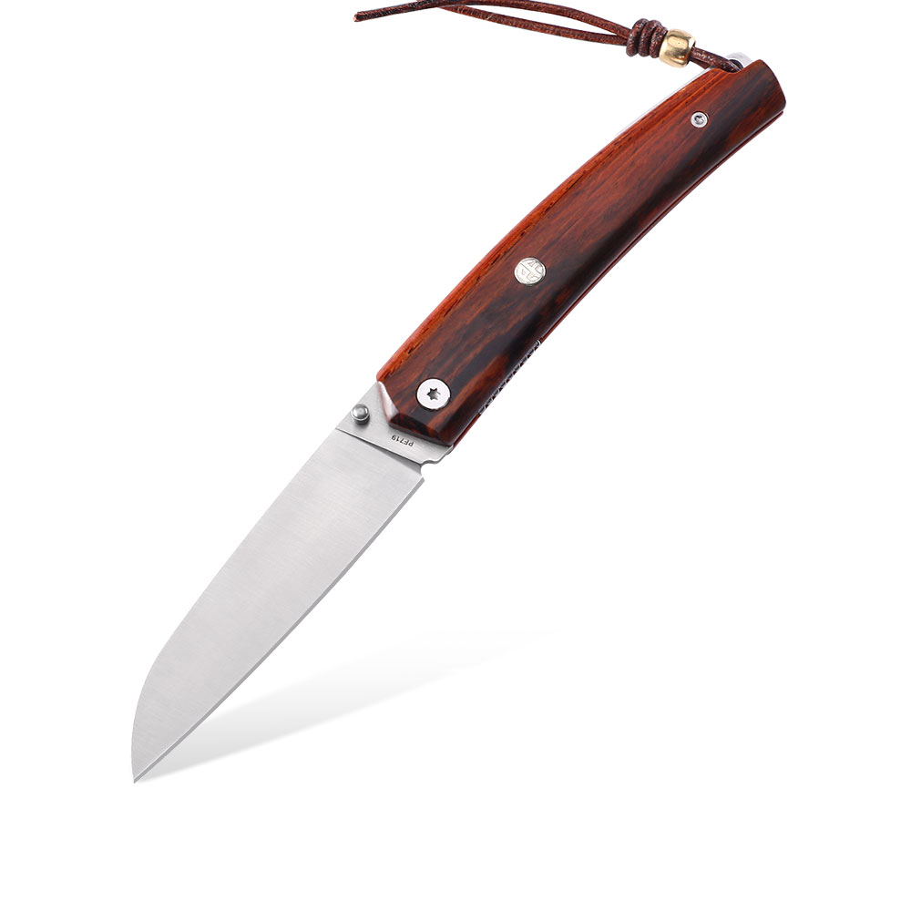 Nóż składany Petrified Fish Patte PF-719 WOS posiada ostrze typu sheepsfoot ze stali Sandvik 12C27N. Rękojeść noża wykonana została lekkiego i wytrzymałego drzewa sandałowego. Otwieranie noża następuję za sprawą kołka a ostrze blokuje blokada typu liner lock.