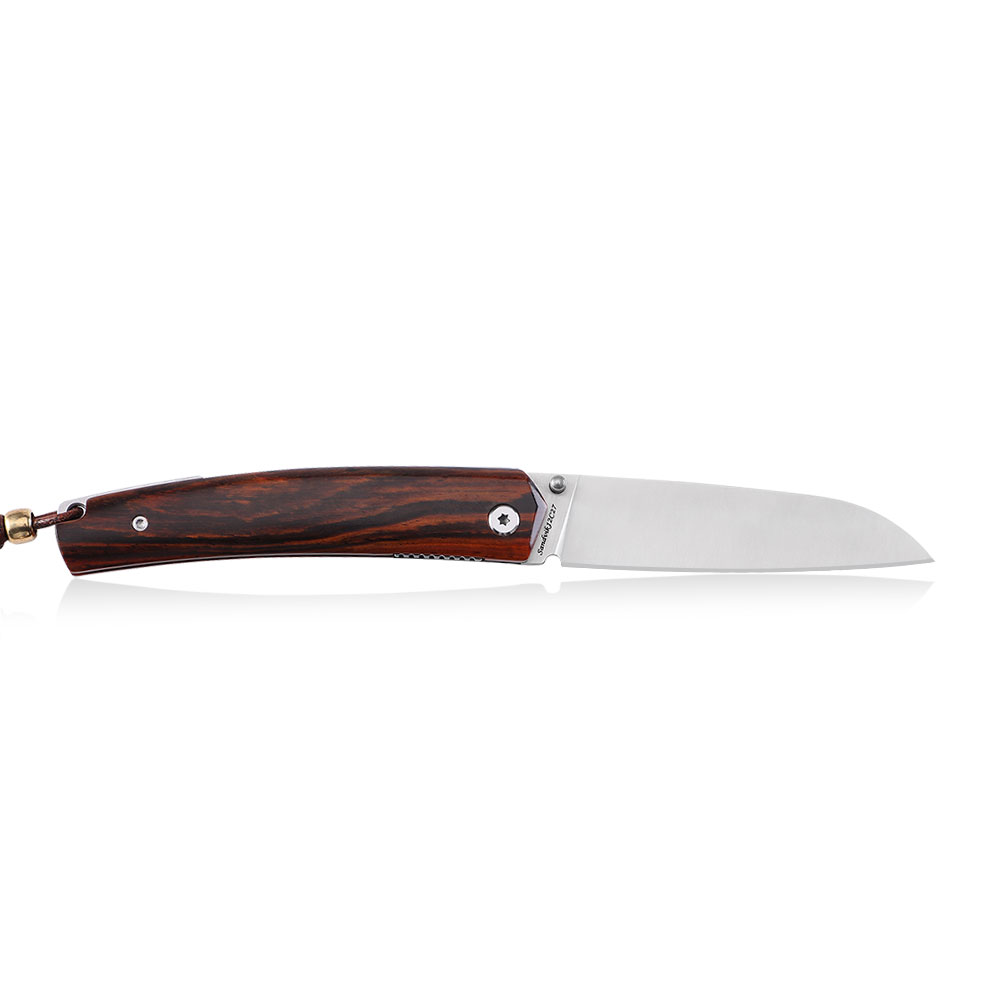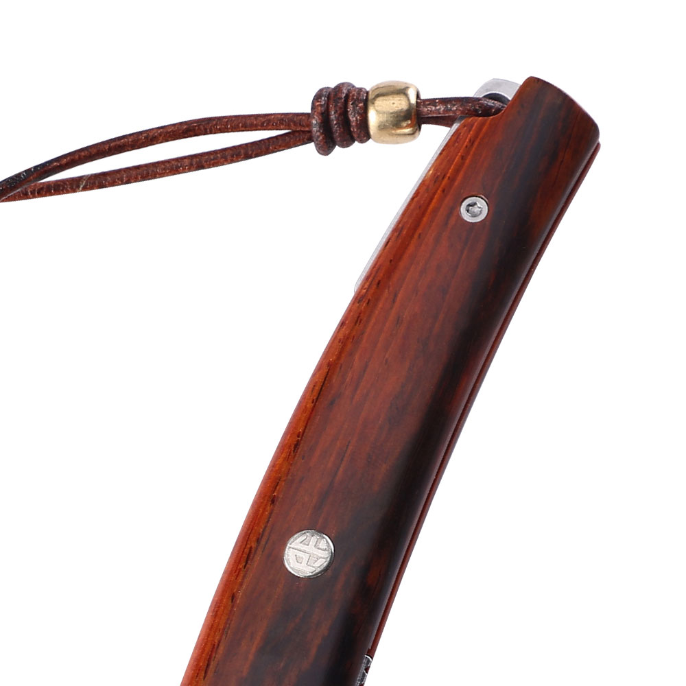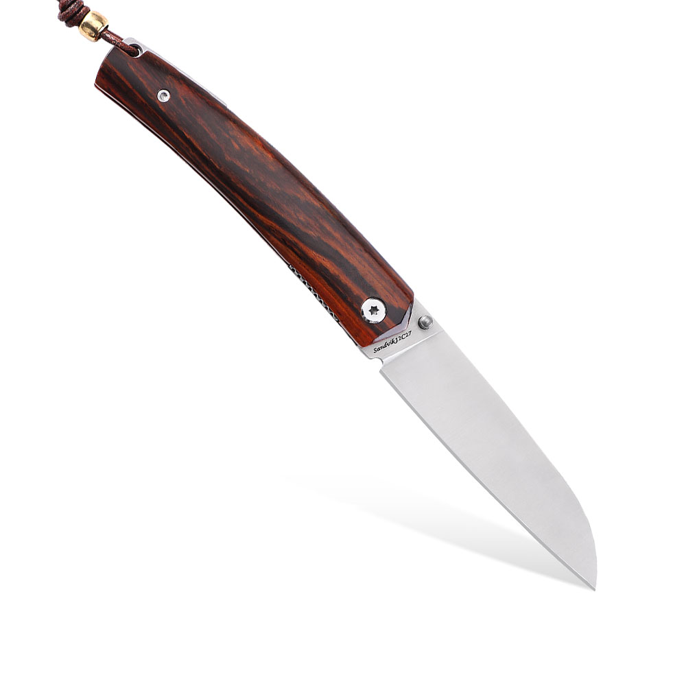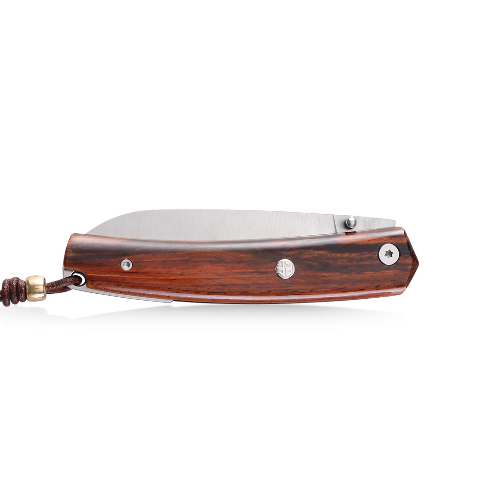 Okładziny rękojeści wykonane zostały z drzewa sandałowego. Lekkie, miłe w dotyku, wytrzymałe, posiadające ciekawą fakturę i ubarwienie prezentuje się bardzo elegancko. Okładziny zostały przykręcone śrubami do stalowej konstrukcji rękojeści (linersy) a w tylnej części całość została wzmocniona tytnowym backspacer’em. Rękojeść zdobi dodatkowo mosiężny pin z logo producenta. Na zakończeniu backspacer’a zaprojektowano otwór na smycz, paracord, sznurek, linkę itp. rozwiązania zabezpieczające nóż przed zgubieniem. Oryginalnie do otworu przytwierdzono odcinek skórzanego rzemienia z mosiężnym koralikiem.