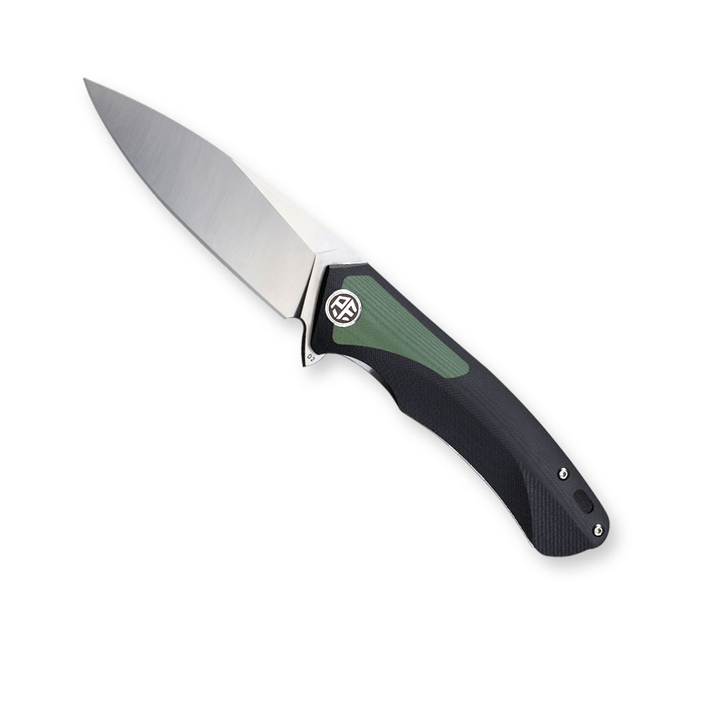 Nóż składany Petrified Fish Pub PF-838 Pub GRS Green-Satin posiada wydajne ostrze typu drop point ze znanej z efektywności cięcia i nieuciążliwej w ostrzeniu i pielęgnacji stali D2. Rękojeść noża wykonana została z czarnego kompozytu G10 z zielnymi wstawkami. Otwieranie noża następuję za sprawą wystającej płetwy (flipper) a ostrze blokuje blokada typu liner lock.