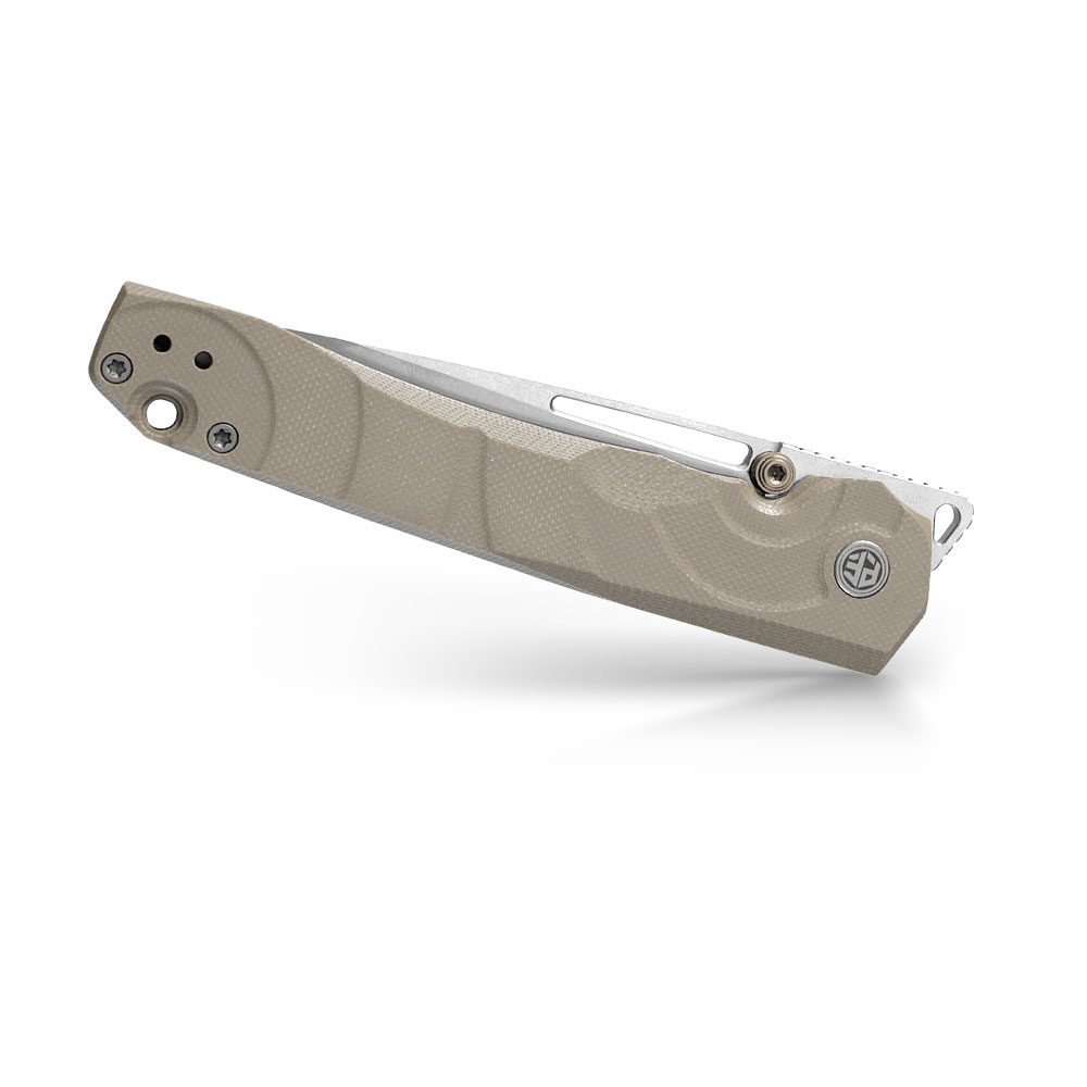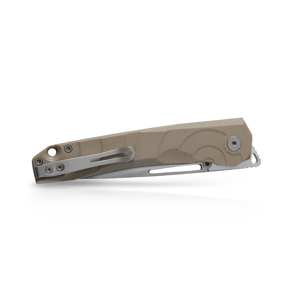 - Rękojeść: Khaki G10, stalowe linersy, klips stalowy (Tip-Up, Deep Carry, przekładalny na drugą stronę)